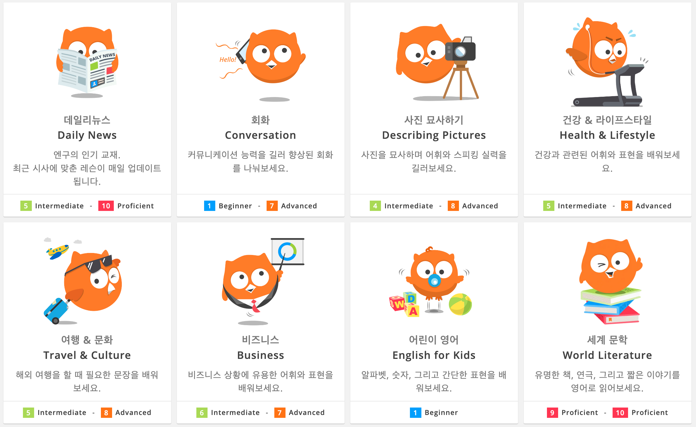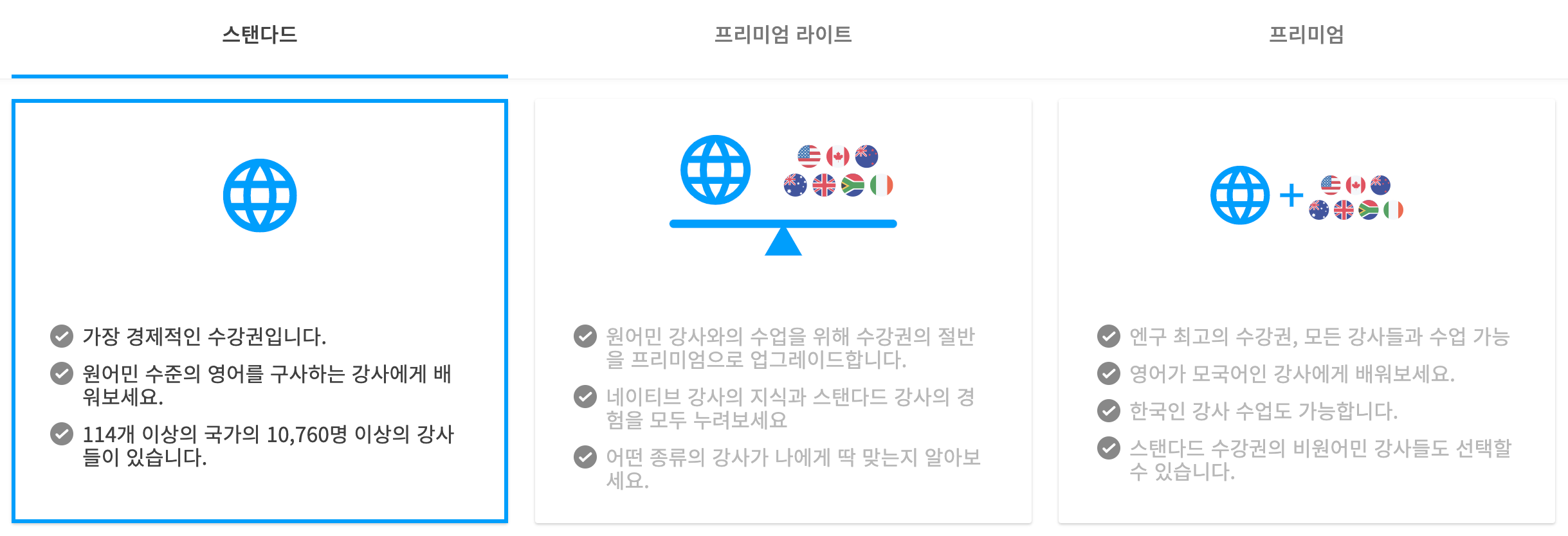 프리미엄 : 미국, 캐나다, 영국, 뉴질랜드, 호주, 남아프리카, 아일랜드의 원어민 튜터와 비원어민 튜터의 수업을 모두 수강할 수 있습니다.