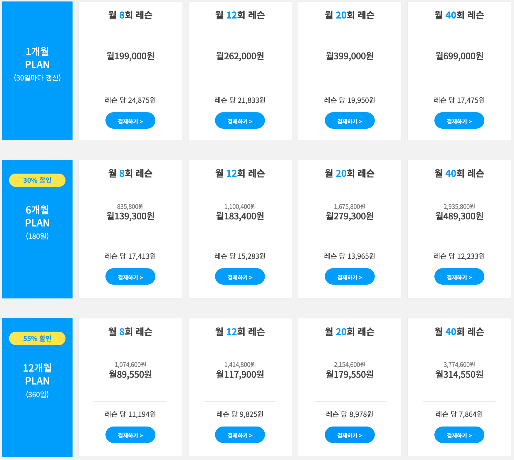 1개월 캠블리 (30분) 엔구 (프리미엄, 25분) 주 2회 (월 8회) 130,000 원 199,000 원 주 3회 (월 12회) 168,000 원 262,000 원 주 5회 (월 20회) 290,000 원 399,000 원