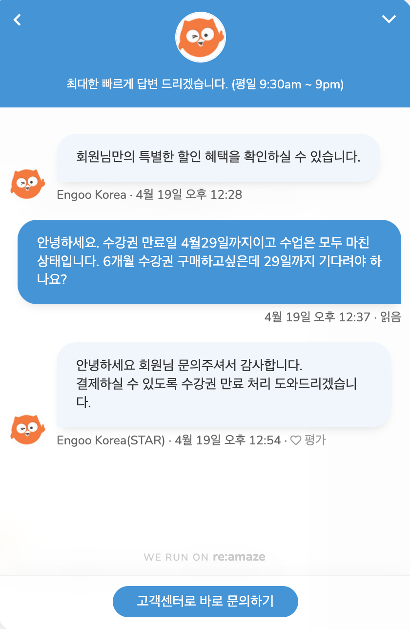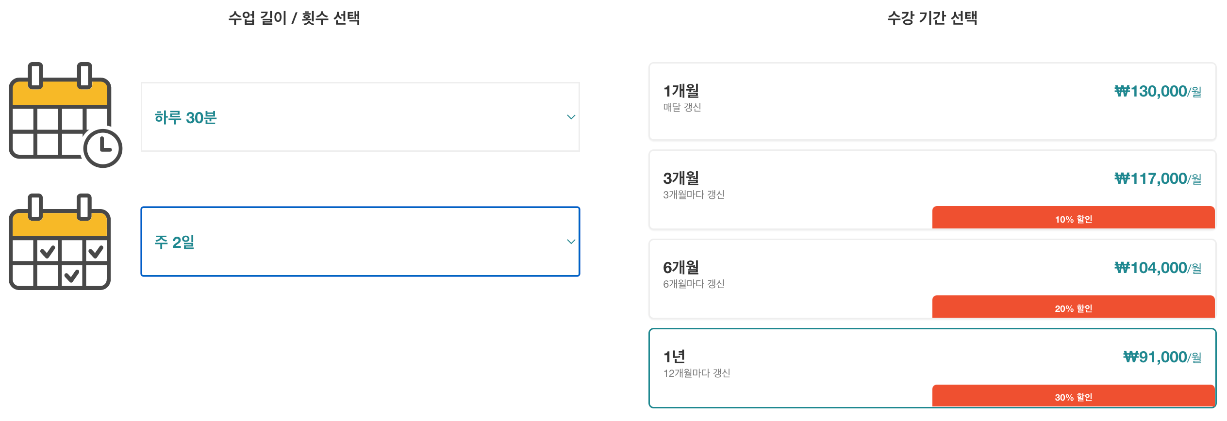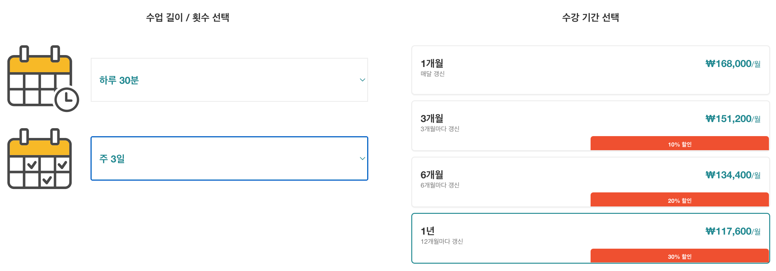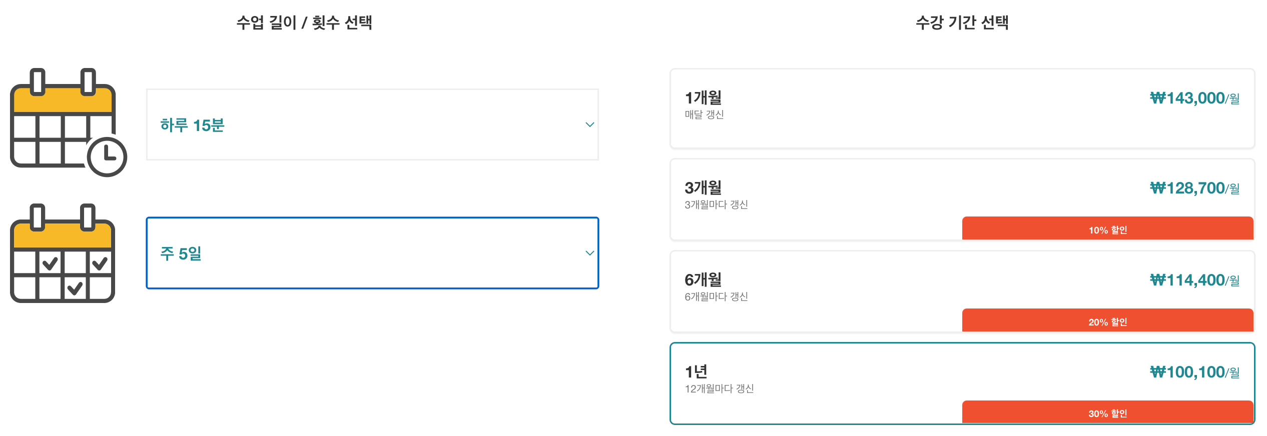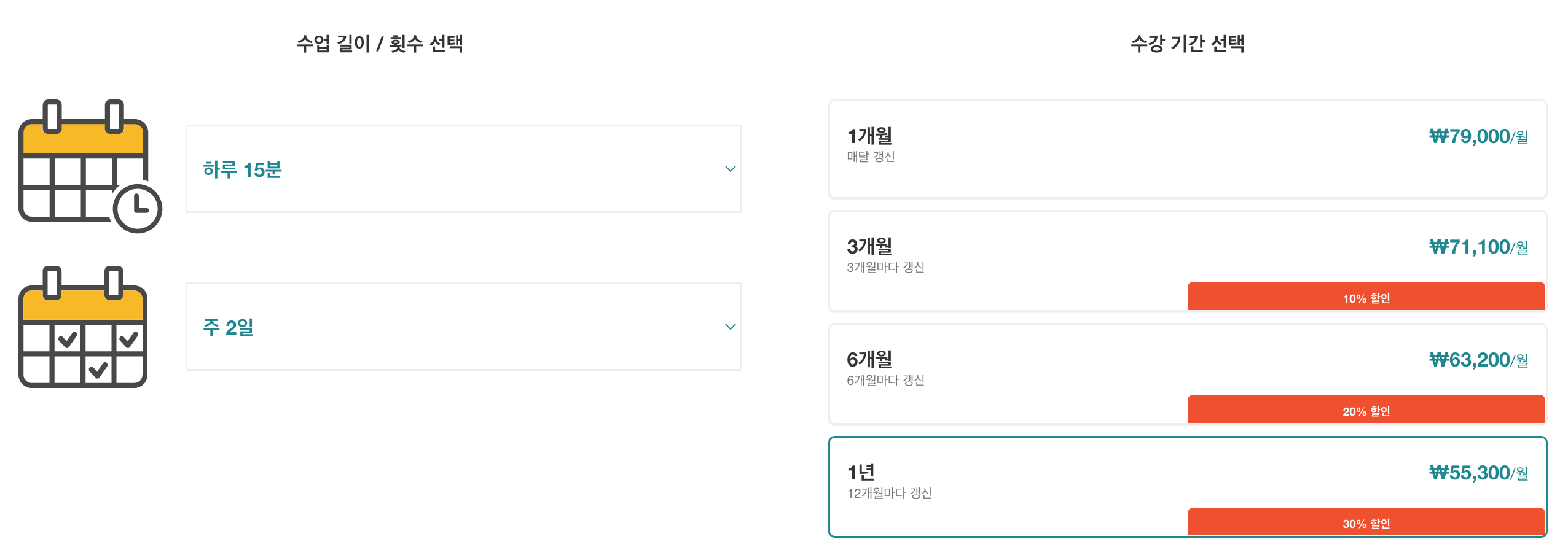 엔구와 캠블리 모두 장기 수강권일수록 할인율이 높아집니다.
