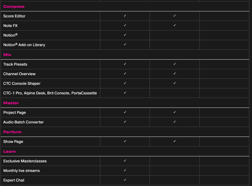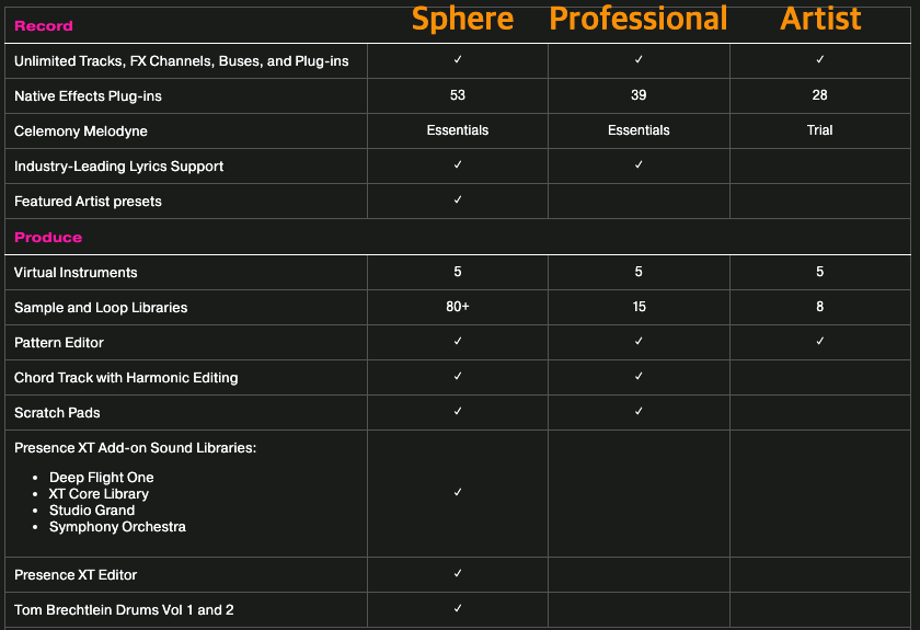 스튜디오원은 프라임, 아티스트, 프로페셔널의 3가지 버전과 구독형 모델인 PreSonus Sphere가 있습니다.