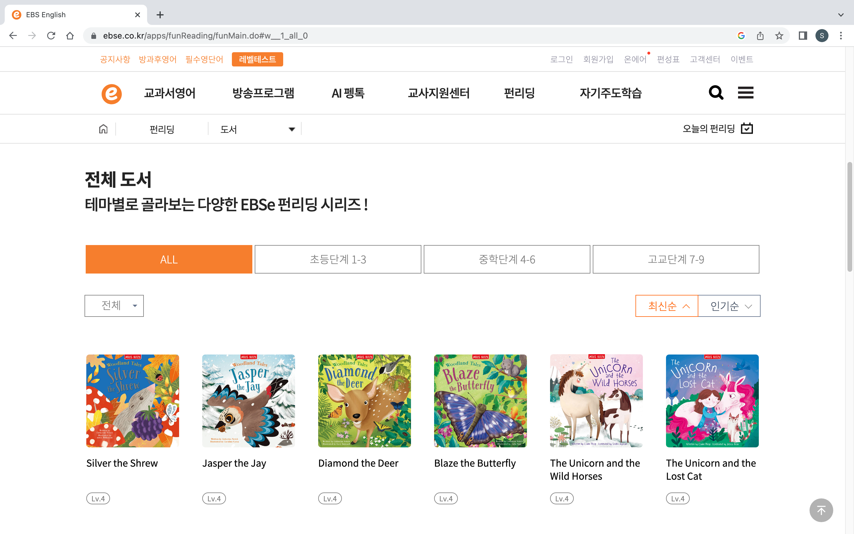 시리즈, 소설, 비소설, 파닉스, 만화 등의 카테고리로 나뉘어 있고요.