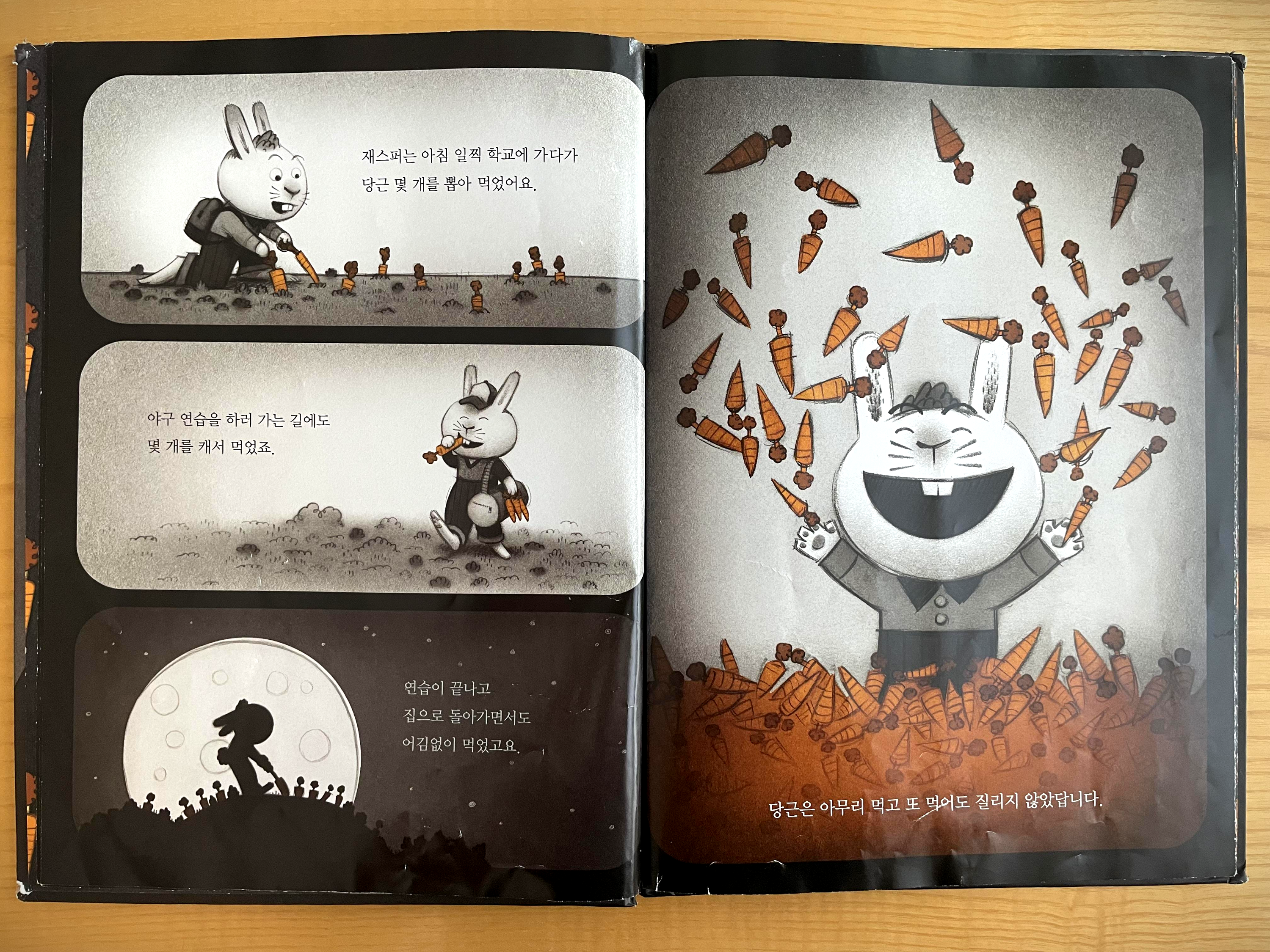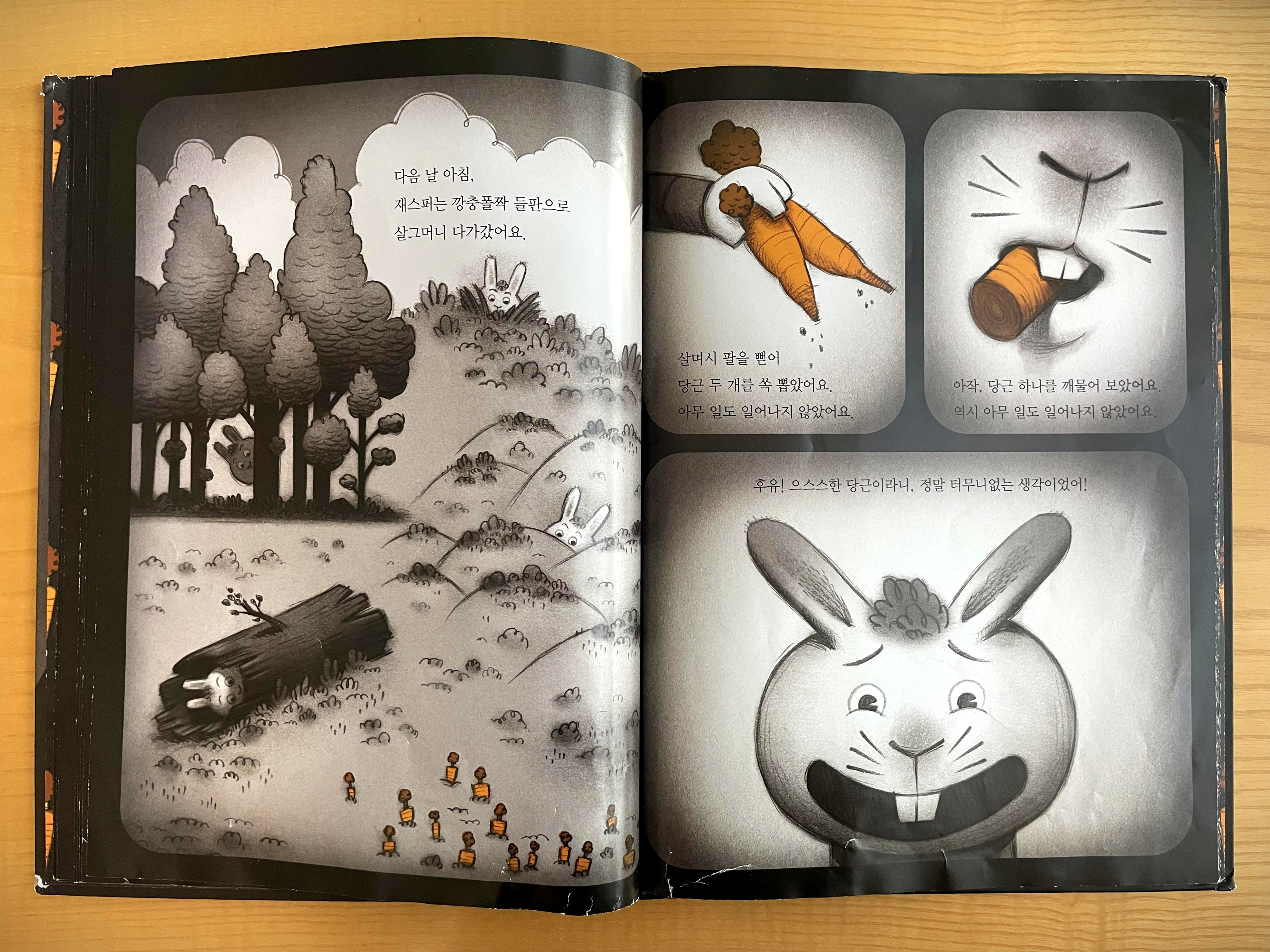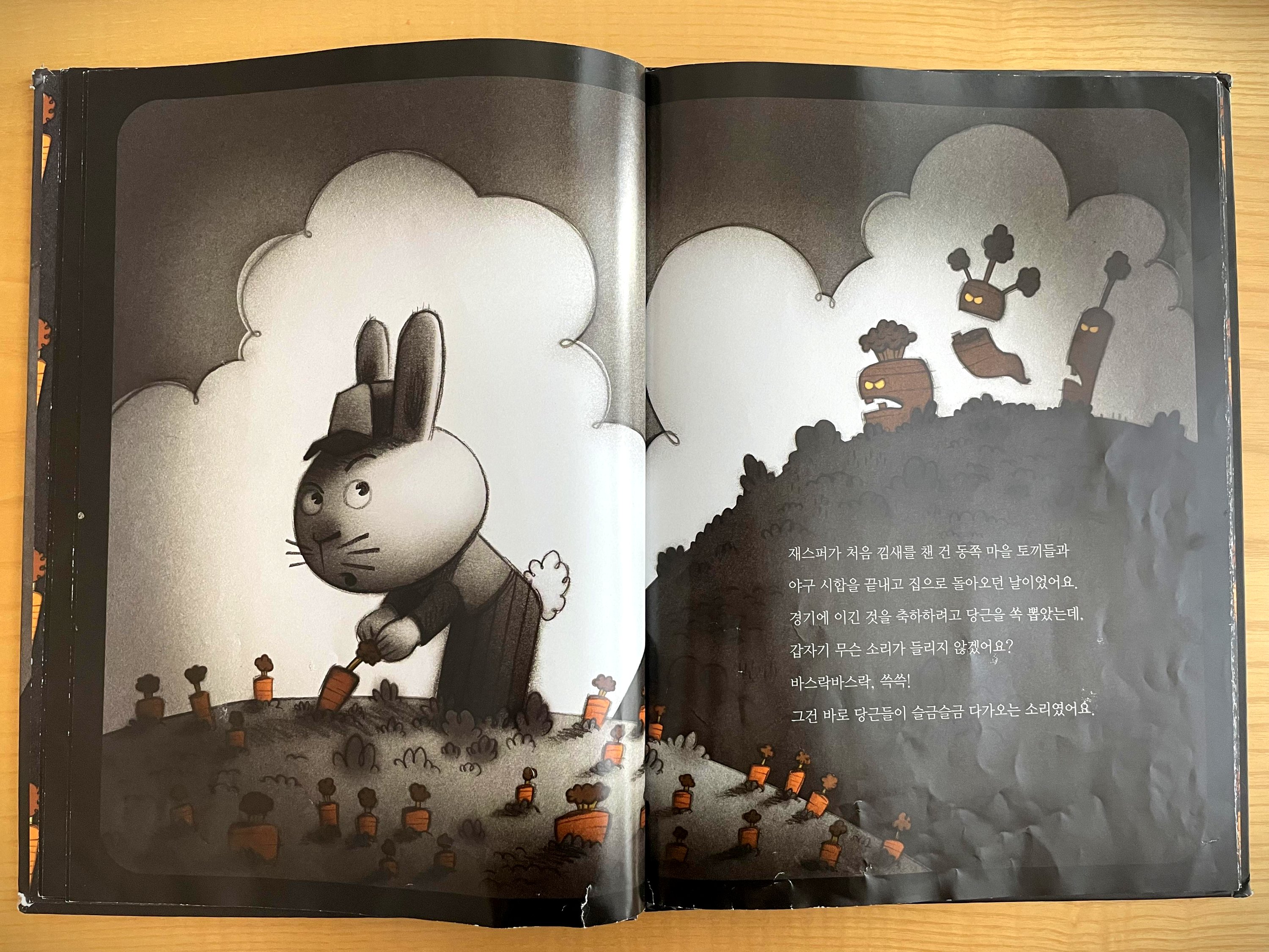 주인공 토끼 재스퍼가 당근을 먹는 장면으로 이야기가 시작됩니다.