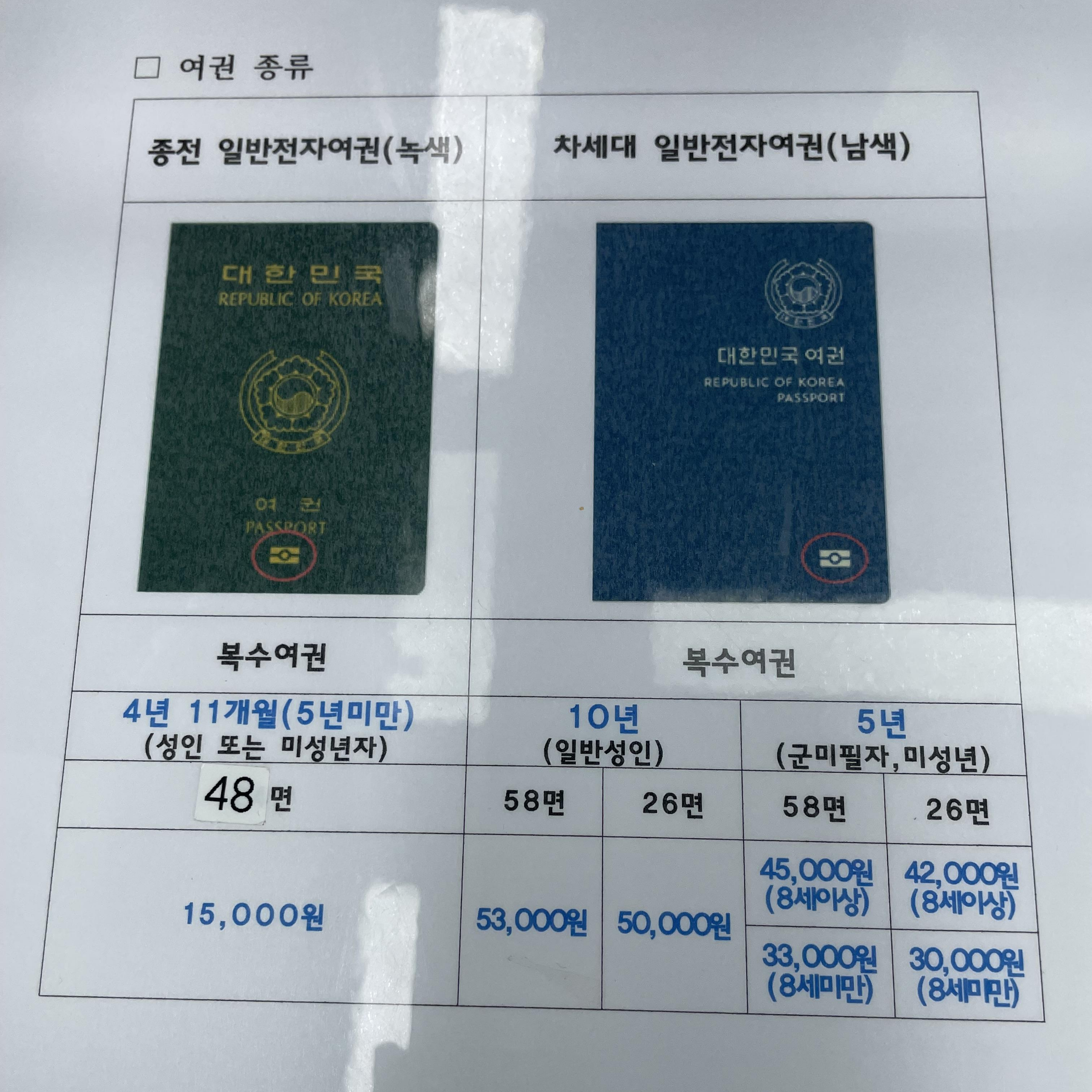 (종전 녹색 일반여권)24면(소진시 48면) 15,000원 단수여권 1년 이내 x 20,000원 일반여권 종류