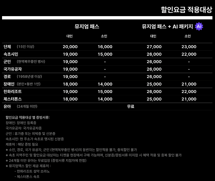 대인(중학생 부터) 뮤지엄 패스 22,000원 / 뮤지엄 패스+AI 패키지 29,000원