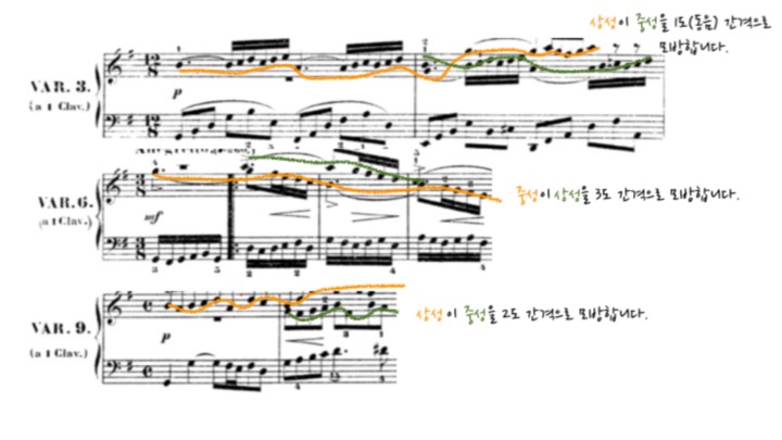 이 작품은 총 32개의 곡으로 주제(Aria) - 30개의 변주곡 - 주제(Aria)의 구조를 이루고 있으며, 곡의 중간 부분인 16 변주곡을 중심으로 크게 1부(아리아~15 변주)와 2부(16 변주~아리아)로 나눌 수 있습니다. 주제가 수미상관을 이루며 그 사이에 자리한 30개의 변주곡은 놀라울 정도로 치밀한 수학적 논리를 통해 서로 단단하게 결합되어 있지요. (참고로 바흐는 독실한 프로테스탄트였습니다.) 이 30개의 변주곡은 자유로운 변주곡 - 기교적 변주곡 - 캐논적 변주곡 순서로 3 개의 곡이 한 조가 되어 10번 반복(3x10=30)됩니다. 또한 3 변주곡, 6 변주곡, 9 변주곡... 등 3의 배수 번호의 변주곡엔 항상 캐논이 자리하는데요. (캐논(Canon) 형식이란, 주어진 한 성부의 멜로디를 다른 성부가 일정한 간격을 두고 충실히 모방하는 음악입니다. ) 이 9개의 캐논은 각각 한 음정씩 증가하는 규칙으로 배열되어 있습니다. 3 변주곡은 1도 캐논, 6 변주곡은 2도 캐논, 9 변주곡은 3도 캐논... 이 되는 것이지요.
