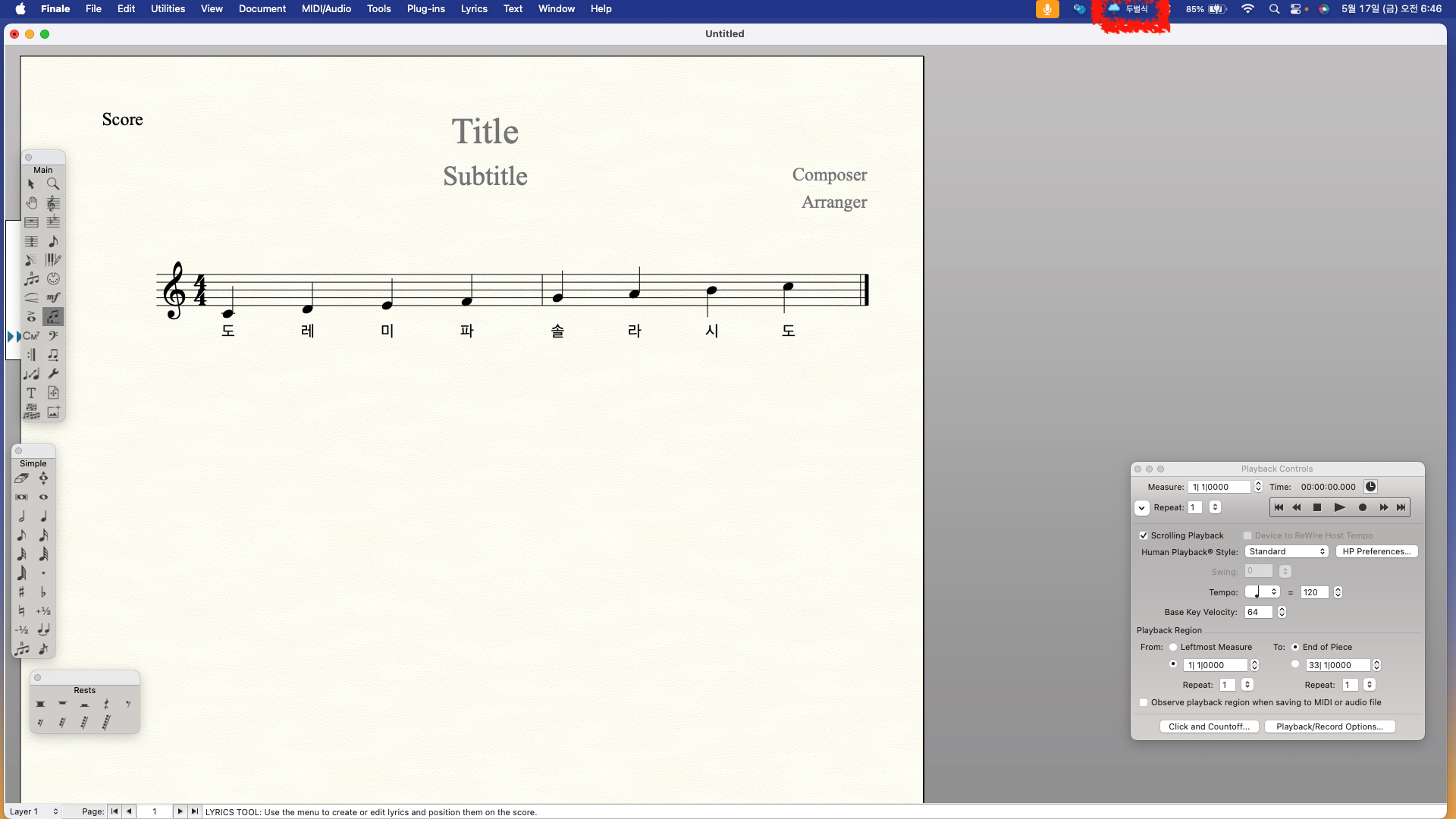 피날레 가사입력 한글 자소분리 위와 같이 피날레 가사 입력 시