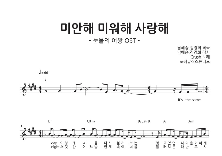 크러쉬 - 미안해 미워해 사랑해 악보 전체 보기