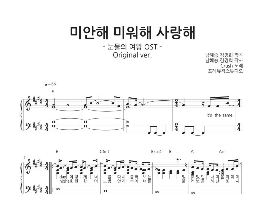 크러쉬 - 미안해 미워해 사랑해 악보 전체 보기