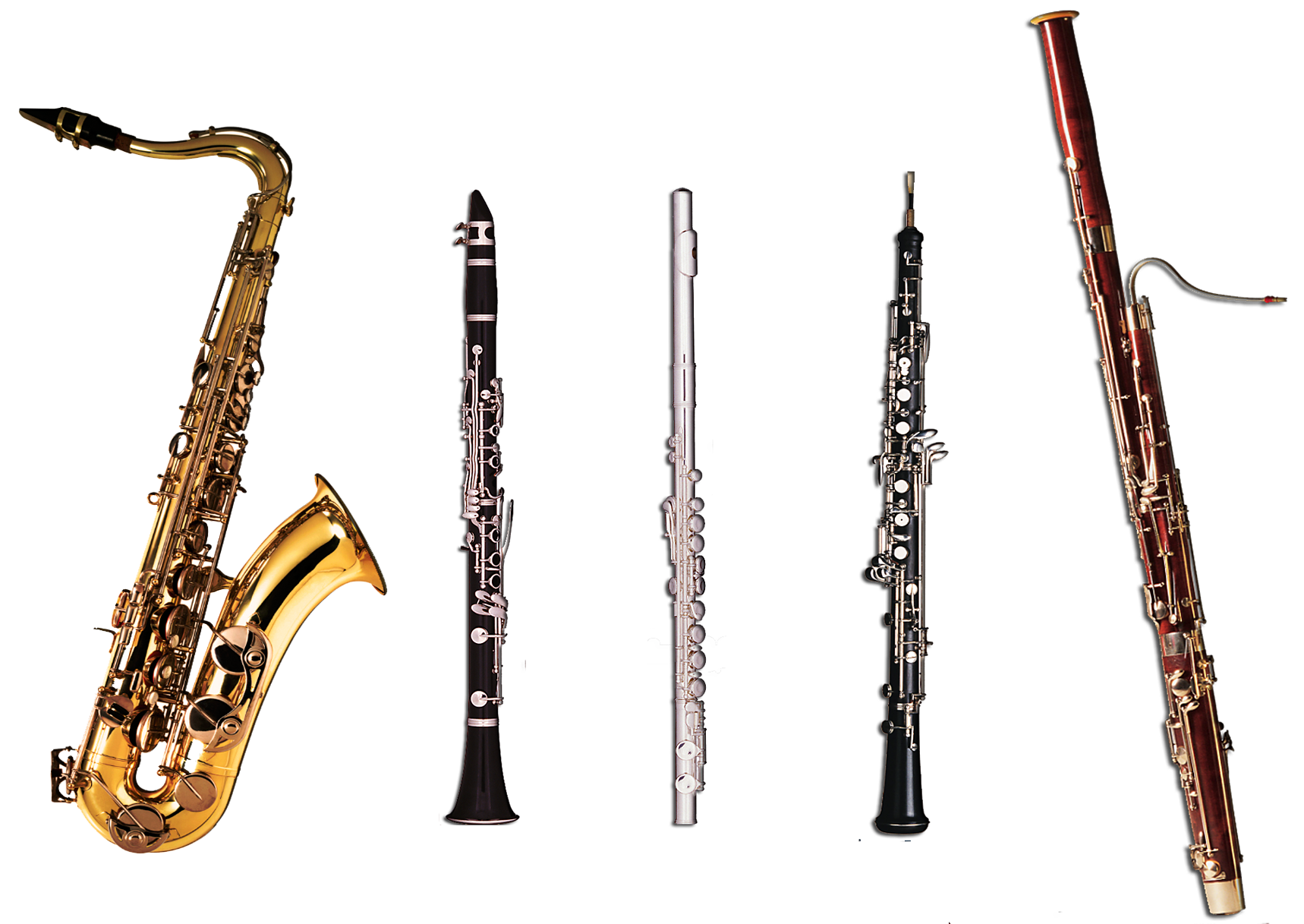 왼쪽부터 색소폰, 클라리넷, 플룻, 오보에, 바순 금관 악기 (Brass instruments)