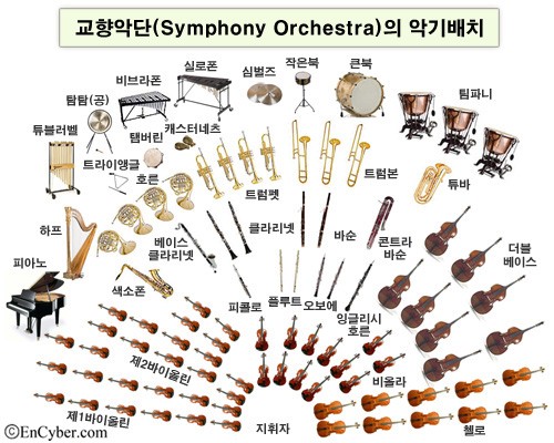 오케스트라에서 악기의 배치는 지휘자마다 다릅니다. 현대 오케스트라에서 쓰이는 악기를 통틀어 '관현악기'라고 하지요. 관현악기는 크게 현악기(String instruments), 목관 악기(Woodwind instruments), 금관 악기(Brass instruments), 그리고 타악기(Percussion)로 구성됩니다. 각 악기군마다 어떤 특징이 있는지, 또 어떤 악기들이 속해있는지 알아보겠습니다.
