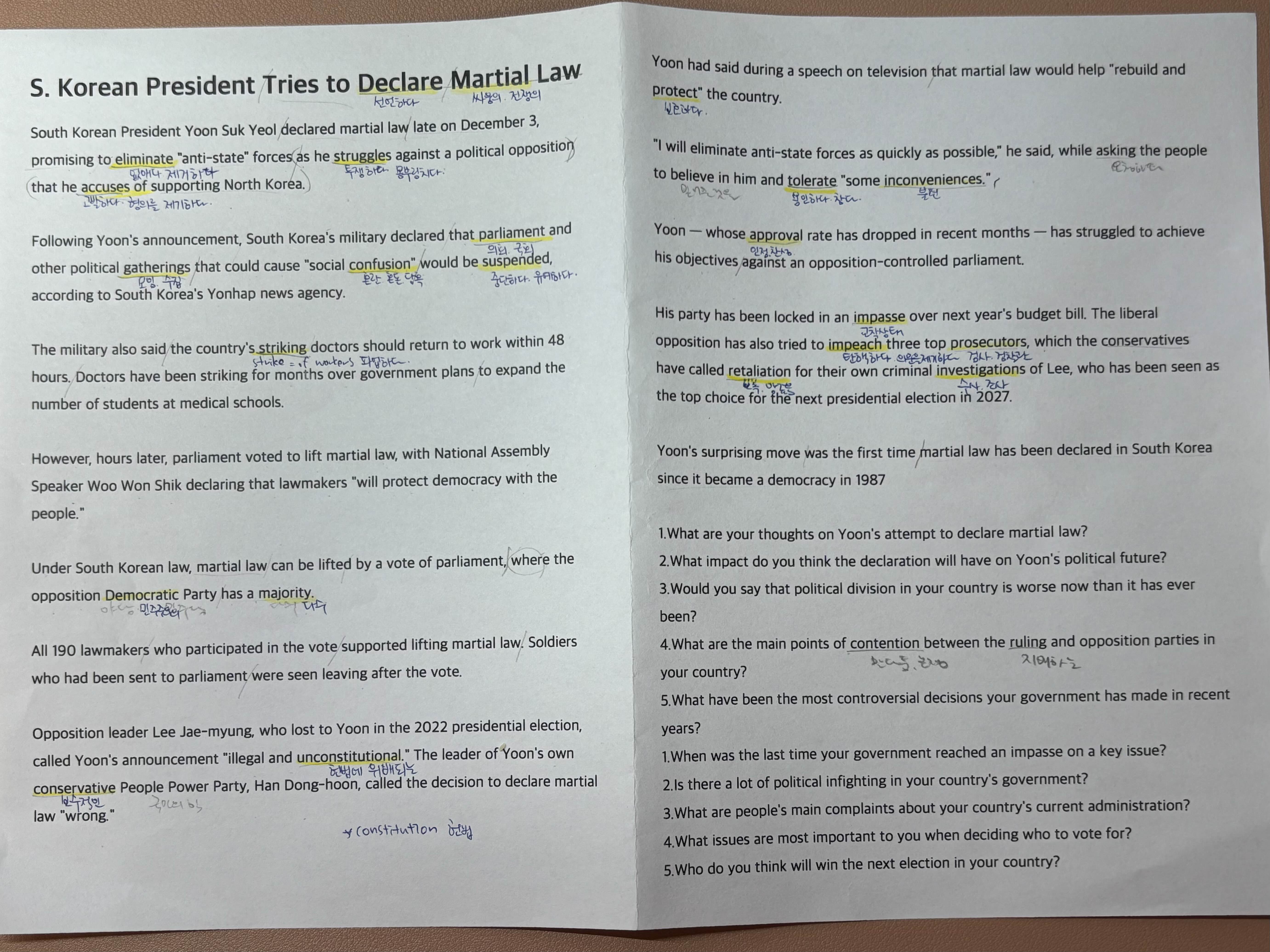 가장 최근에 진행한 토픽은 S. Korean President Tries to Declare Martial Law였어요.
