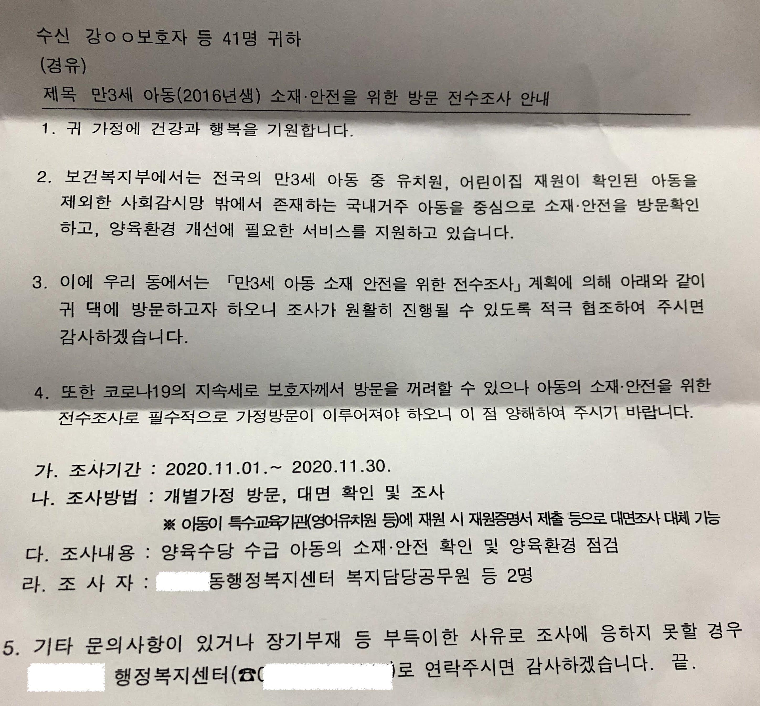 저희 아이와 같이 2016년에 태어난 만 3세 아동 소재 안전을 위한 전수 조사를 실시한다는 내용이었습니다.