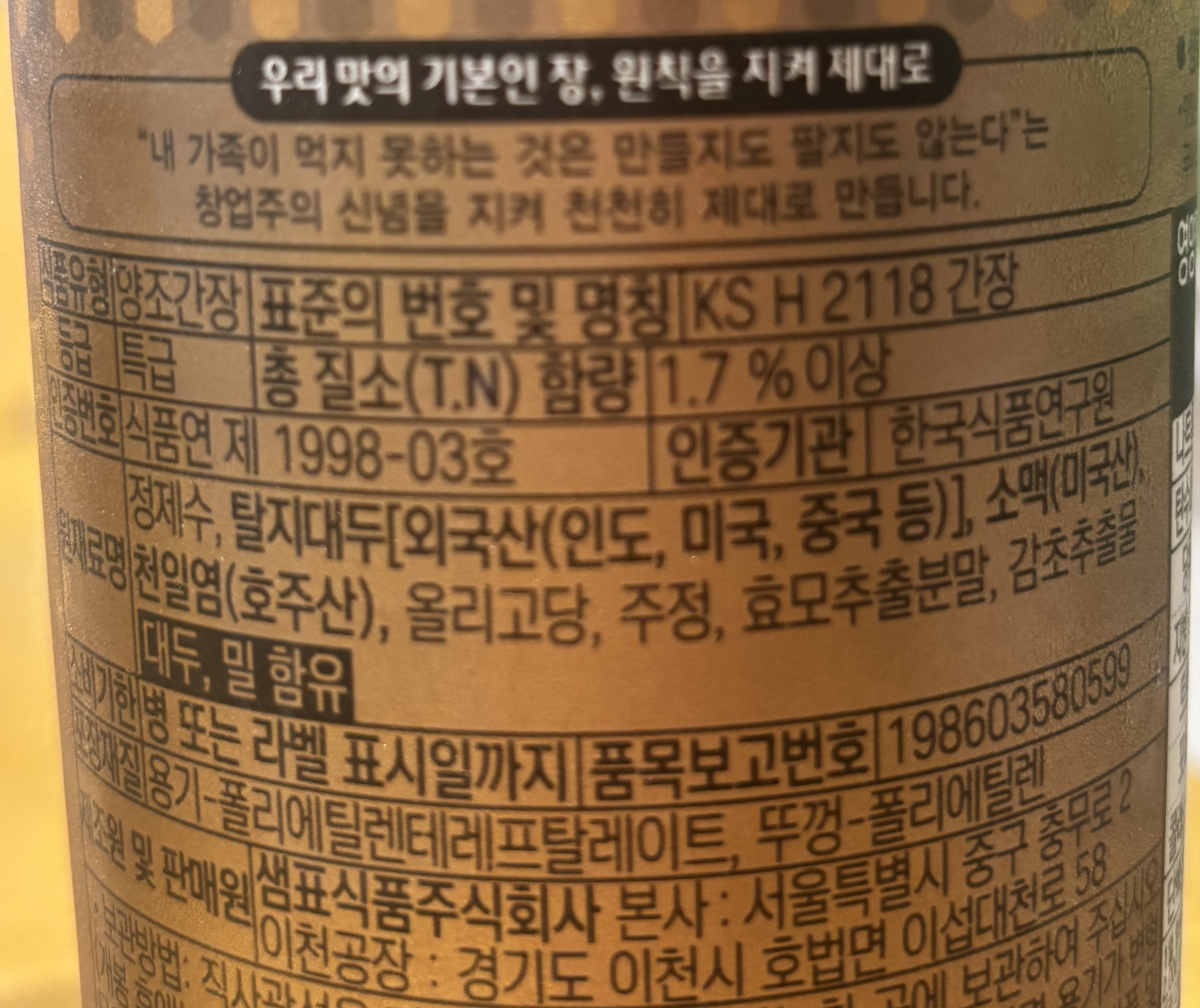 이건 ‘총 질소 함량’이라는 뜻인데, 쉽게 말하면 간장의 감칠맛을 나타내는 지표입니다.- TN 1.5 이상 → 가장 풍미 깊은 고급 간장