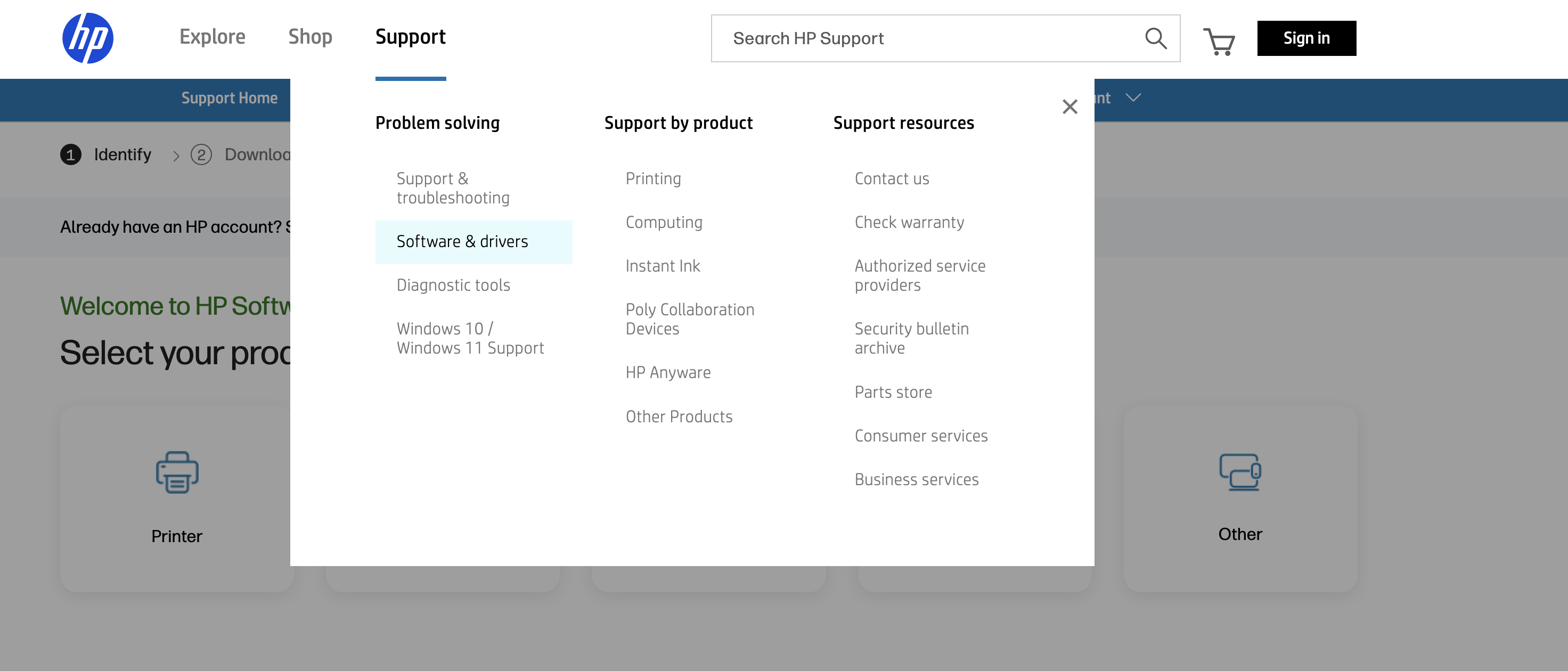 Support - Problem solving - Software & drivers 2. Printer 선택