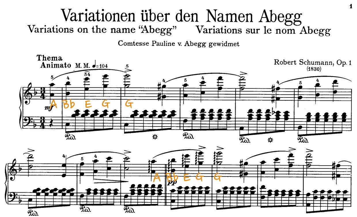독일식 음이름 B는 영미식 음이름 B♭과 같습니다. A-B(B♭)-E-G-G 다섯 개의 음이 주제 동기로 쓰여 '아베크 변주곡'이라고 불리게 되었는데요. 이 'Abegg'의 의미에 대해서는 정확히 밝혀진 바 없으나, 몇 가지 설이 있습니다. 이 작품을 헌정받은 백작의 딸인 파울리네 폰 아베크의 이름을 땄다거나, 그와 친했던 피아니스트 메타 폰 아베크, 또는 역시 그와 친했던 의학도 아우구스트 아베크의 이름이라거나, 무도회에서 한눈에 반한 소녀의 이름이라거나, 아베크라는 여인은 아예 슈만의 상상 속의 인물이라거나... 아베크가 과연 누구인지 정확히 알 길은 없어도, 사랑에 빠진 청춘의 마음을 표현하듯 음악은 로맨틱하고 아름답게 흘러갑니다.