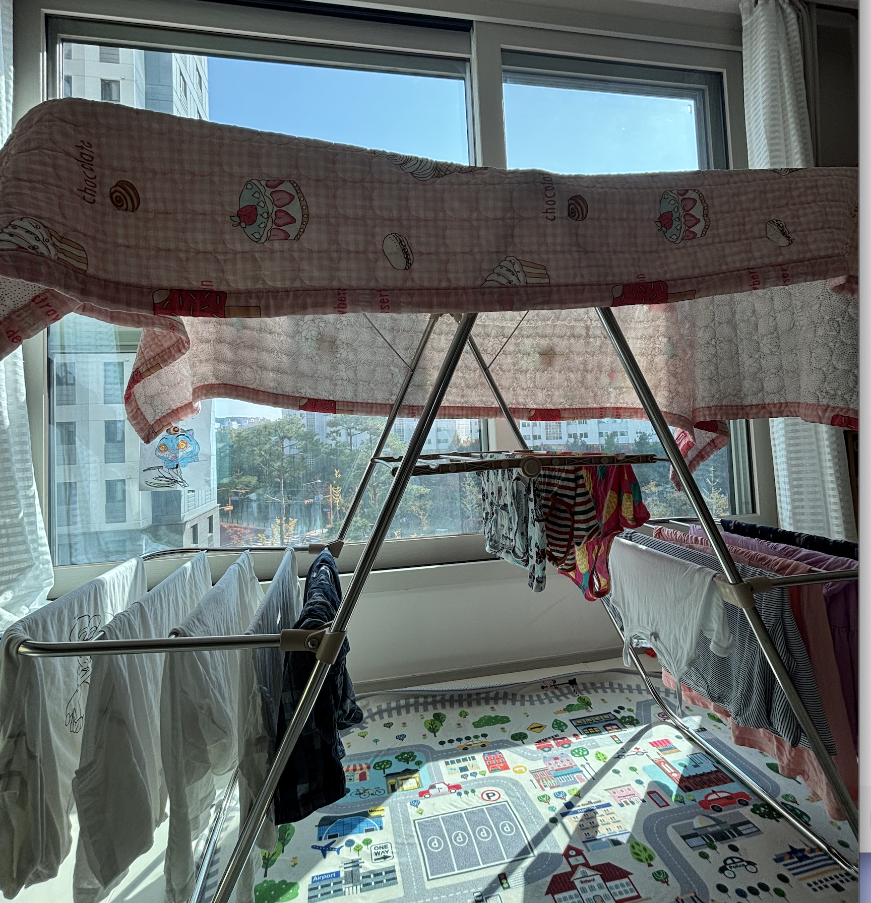 젖은 빨래 널기 저희 집은 건조기를 습한 여름철에만 사용하고, 평소에는 실내 습도 유지를 위해 빨래를 건조대에 너는 편이에요.
