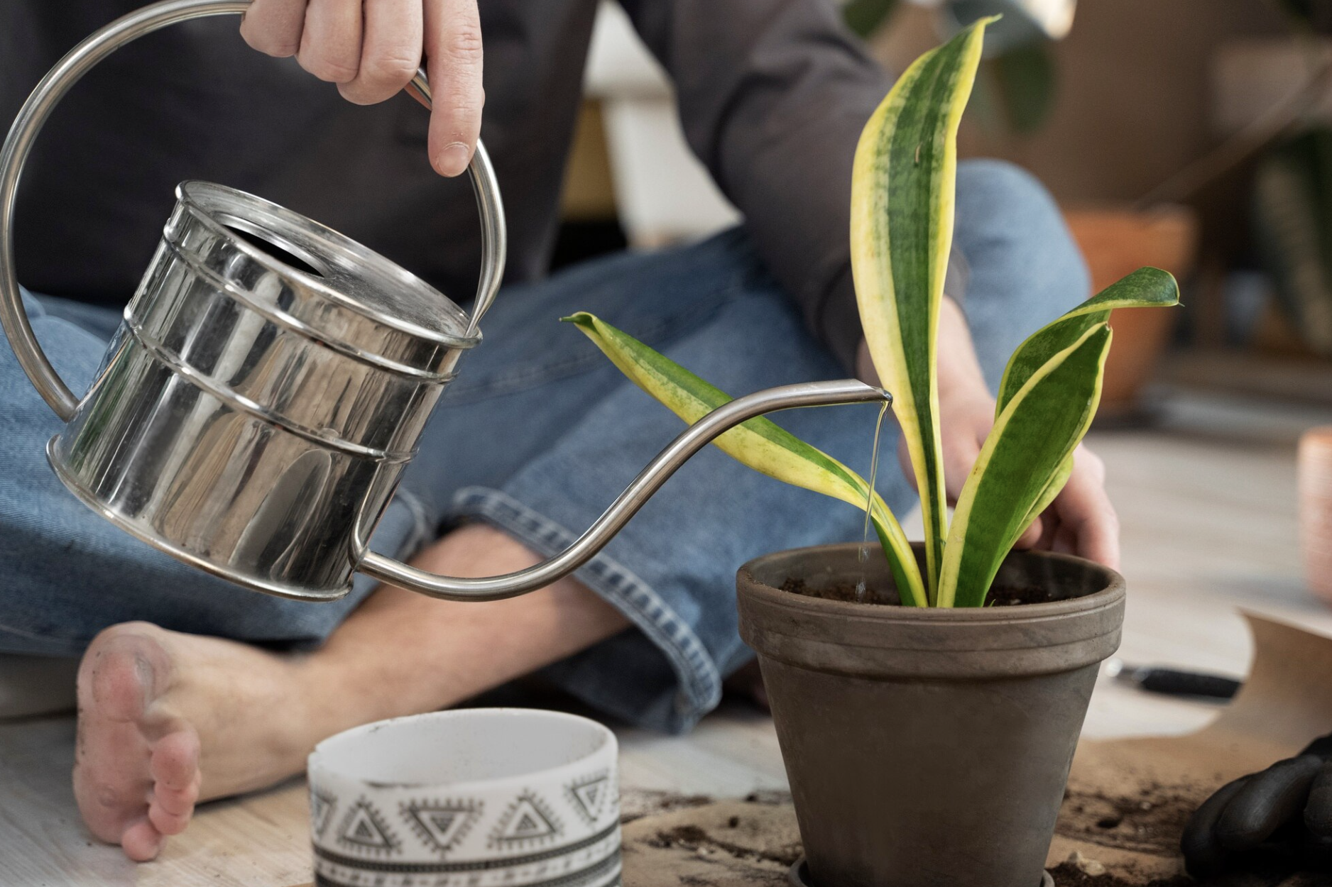 산세베리아 물주기 식물은 뿌리로 흡수한 수분을 잎 표면의 기공으로 발산하여 실내 습도 유지에 도움이 됩니다.