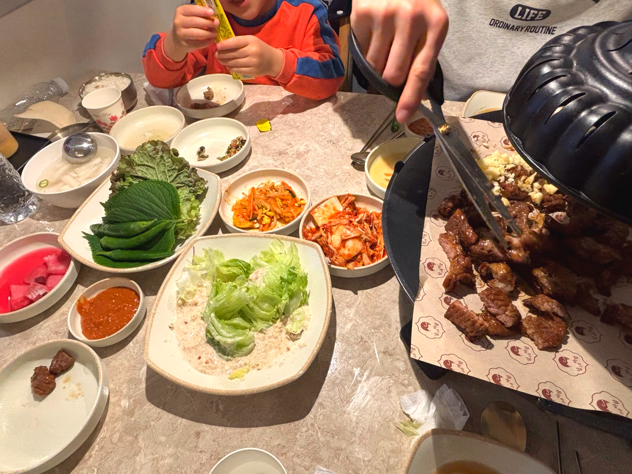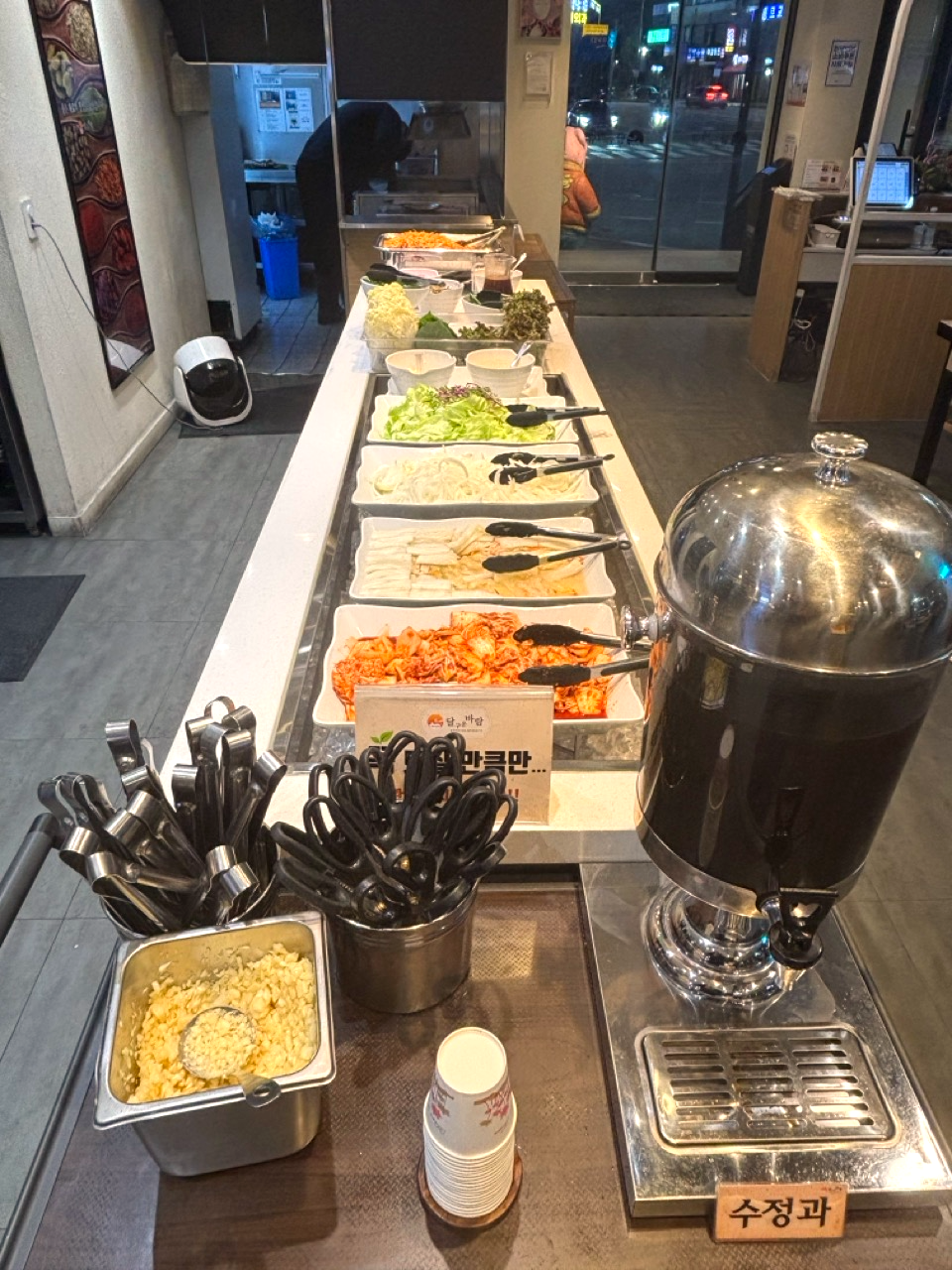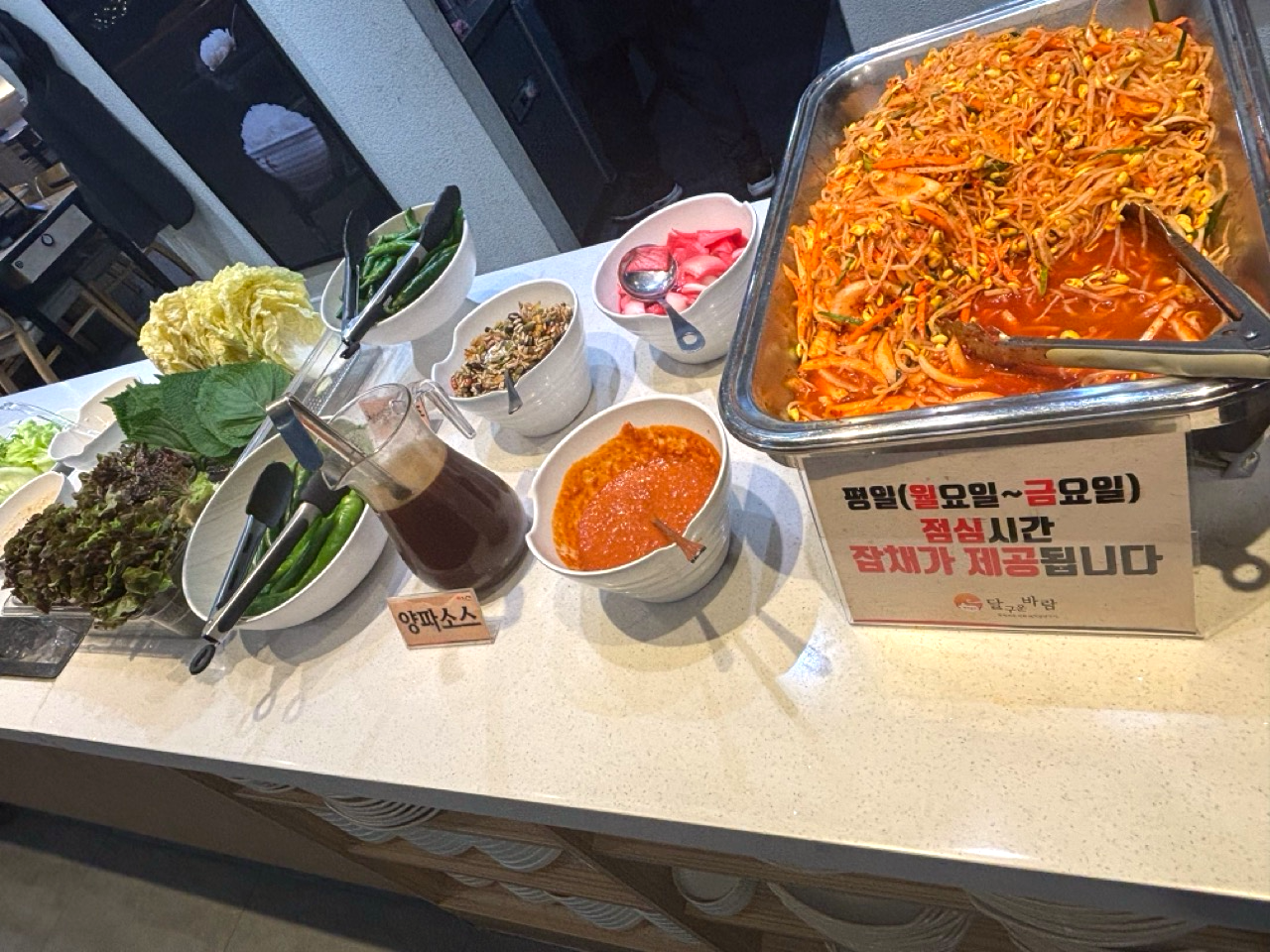 신선한 쌈채소와 김치, 샐러드, 콩나물무침 등을 마음껏 먹을 수 있고요.