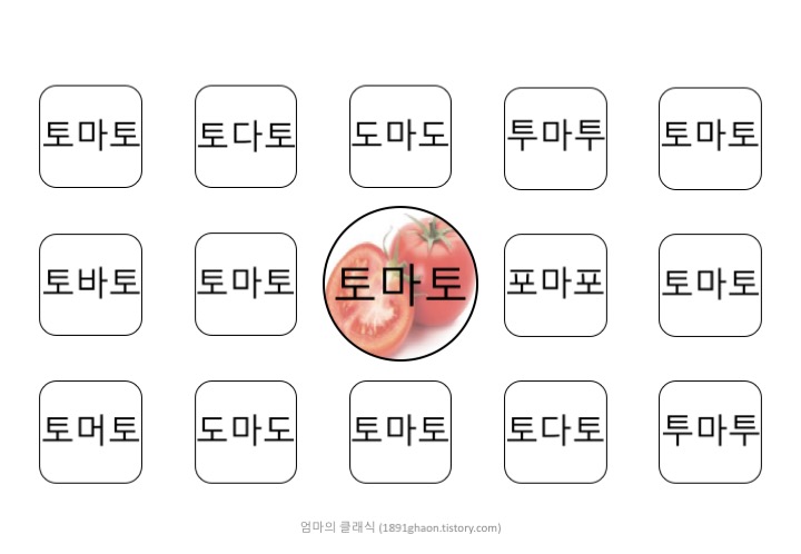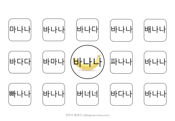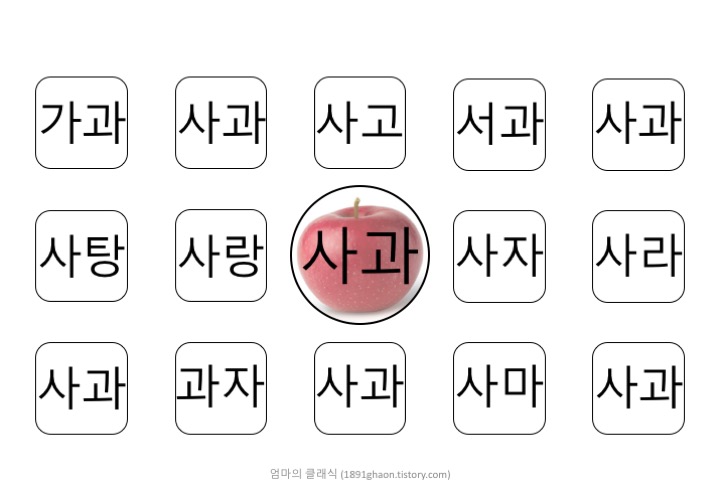 한 글자 당 같은 글자는 4-5개 정도 됩니다. 낱말을 알아갈 즈음엔 과일과 엄마, 아빠의 사진도 넣어 만들어 보았어요.