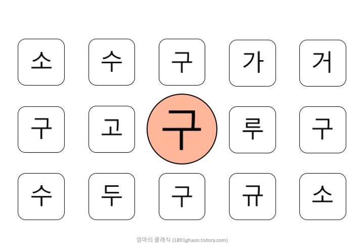 저는 아이가 잘 아는 글자와 조금 헷갈려하는 글자(모음 ㅗ,ㅜ 구분을 어려워하더라고요ㅎㅎ)로 만들어보았어요.