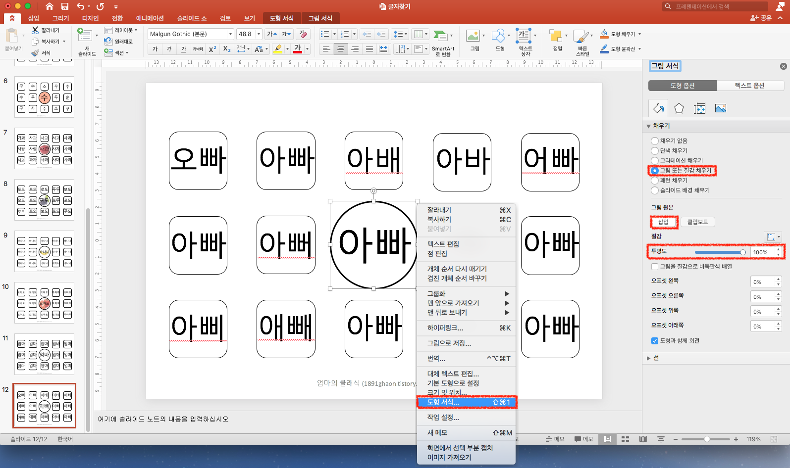 가운데 동그라미 도형 선택 - [오른쪽 마우스] 도형 서식 - [채우기] 그림 또는 질감 채우기 - 그림 삽입 - 크기와 투명도 조절