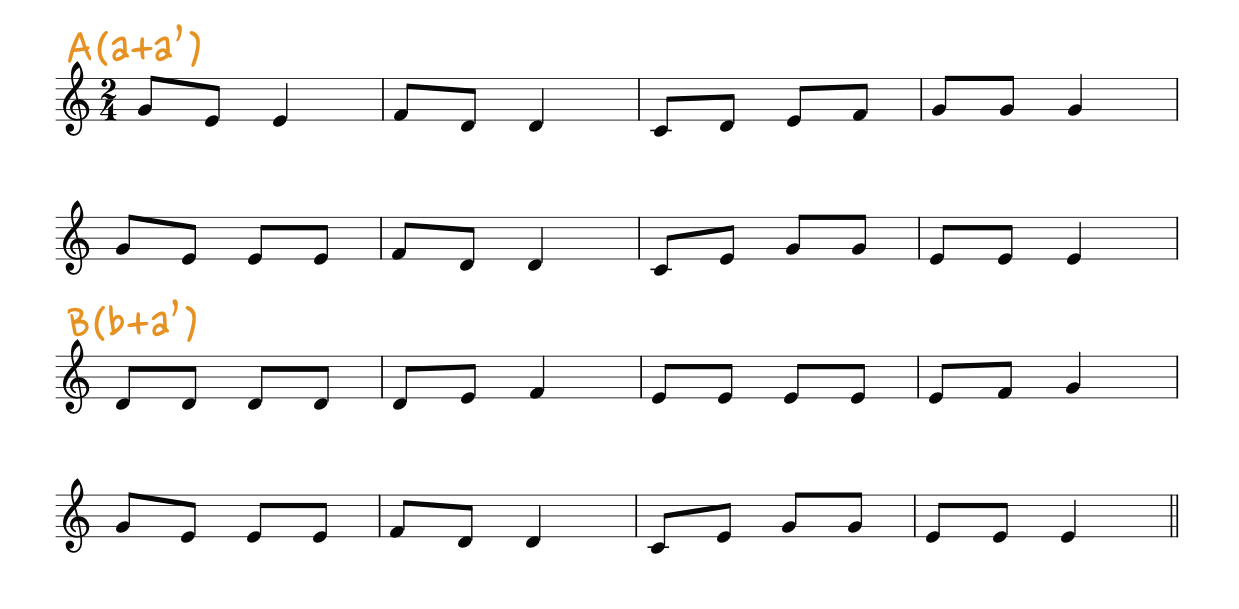 두 개의 큰악절로 구성된 형식입니다. A(a-a')-B(b-a'), A(a-a')-B(b-b') 등의 구조로 이루어집니다.