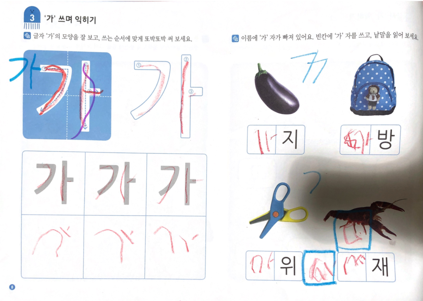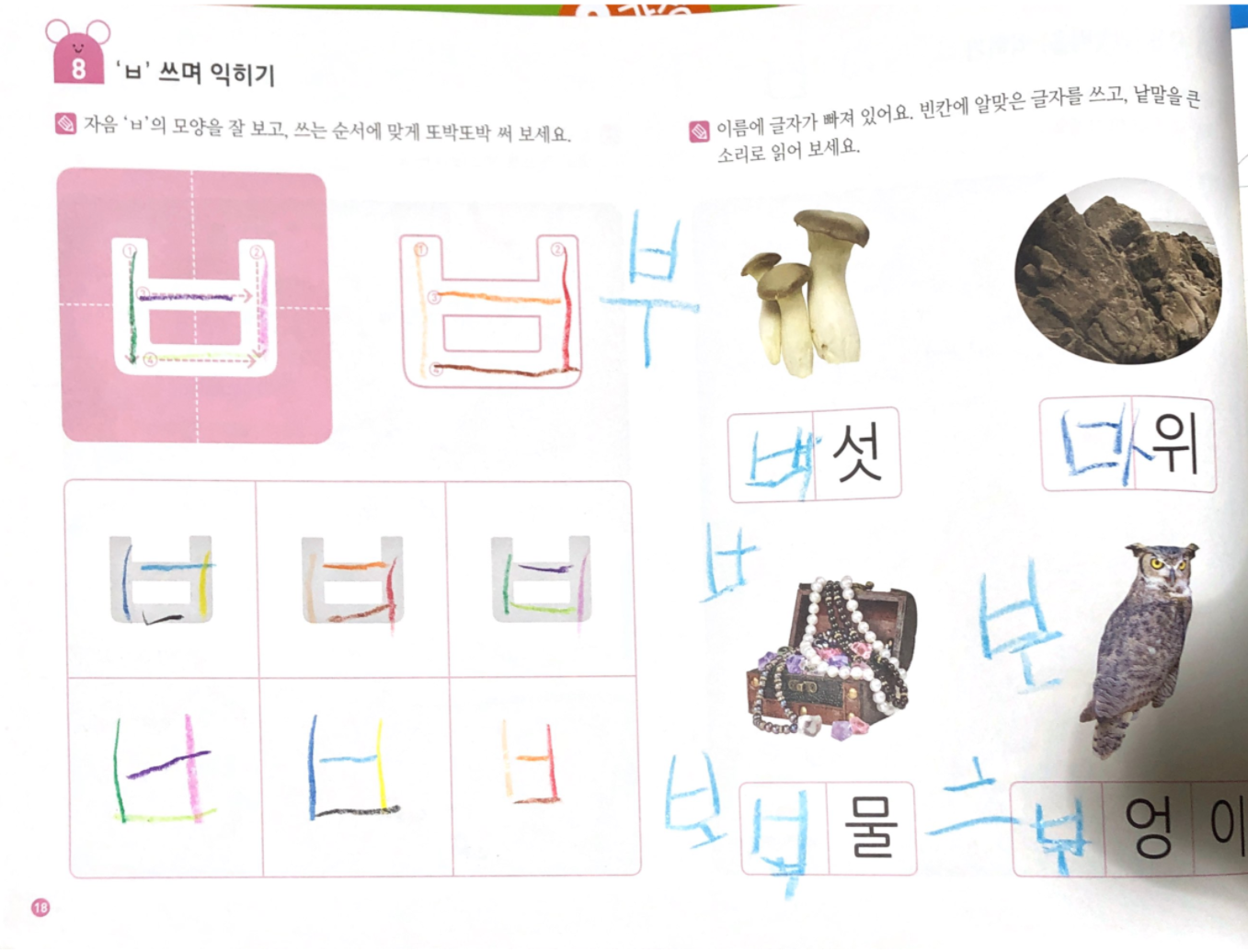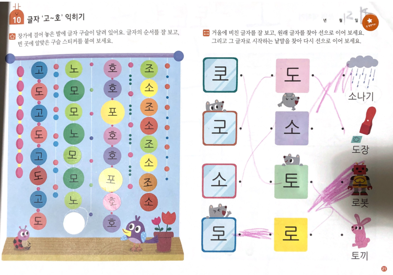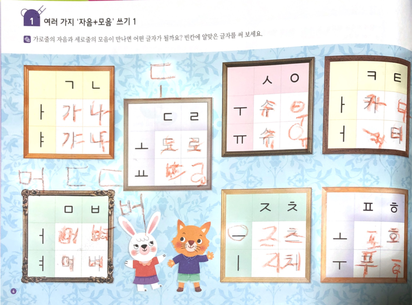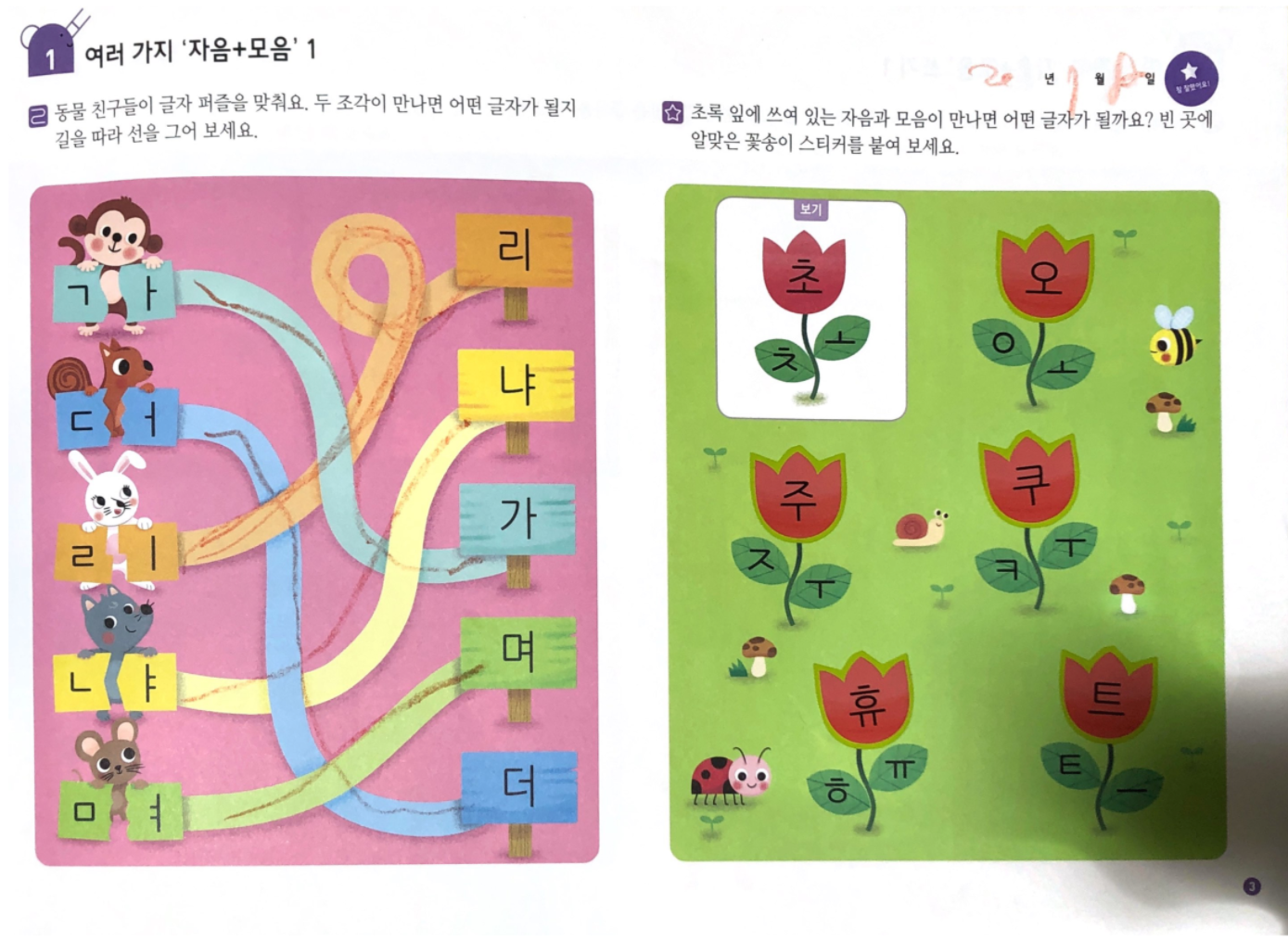 쓰기 분량도 많아지고 저희 아이는 자음과 모음의 결합 원리를 어려워해서 몇 장 풀고 중단했는데요,