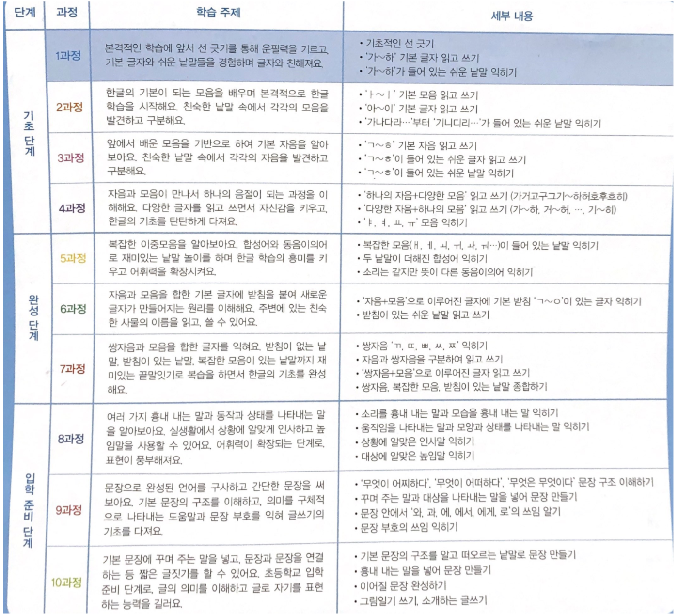 기초 단계 1-4 과정, 완성 단계 5-7 과정, 입학 준비 단계 8-10 과정으로 구성되어 있습니다.