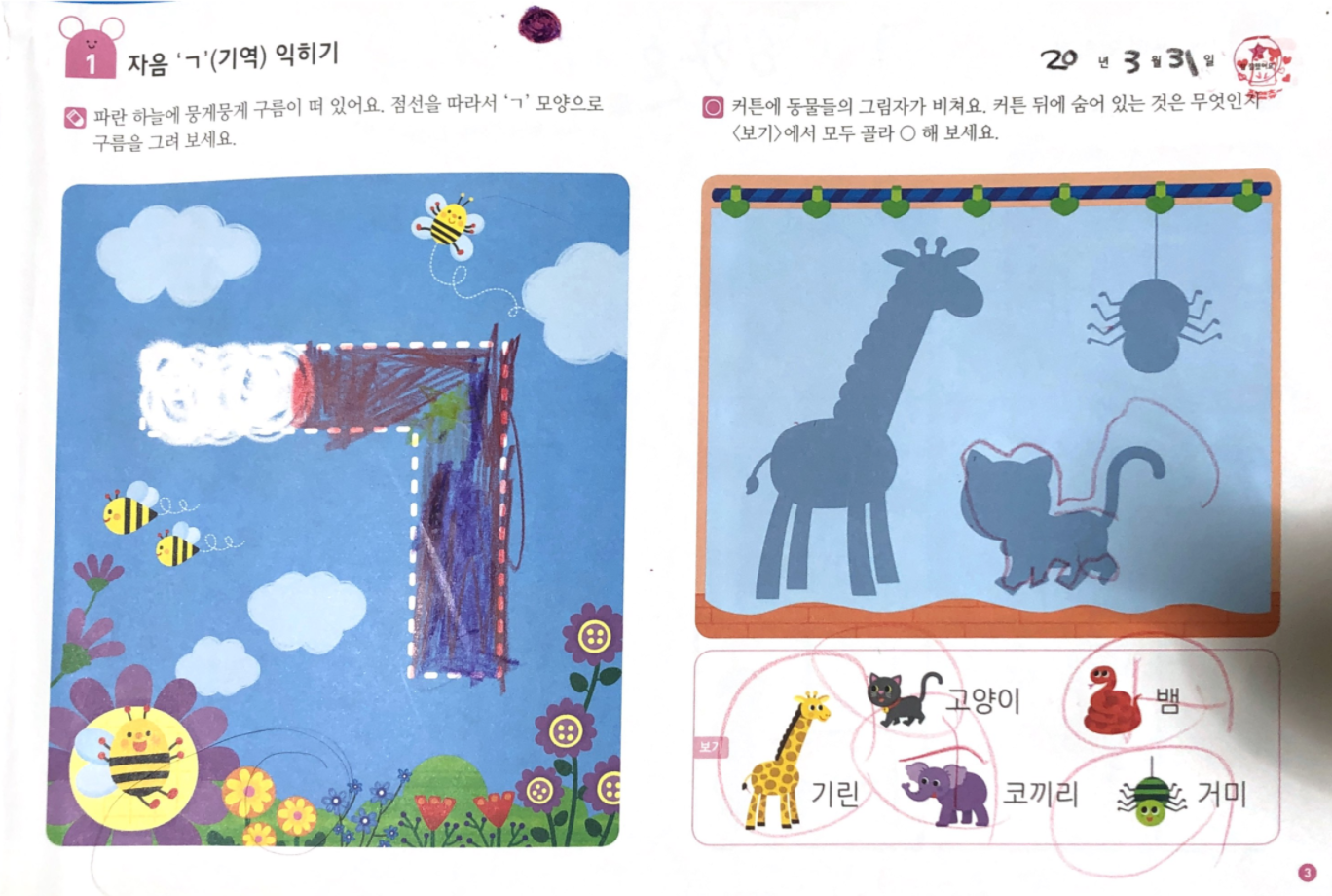 각 장의 앞 쪽에서는 색칠하기, 선 잇기, 미로 찾기, O 하기, 스티커 붙이기 등의 활동을, 뒷 쪽에서 쓰기를 연습하는데요, 다양한 활동으로 구성되어 있어 아이가 무척 재미있어했답니다.