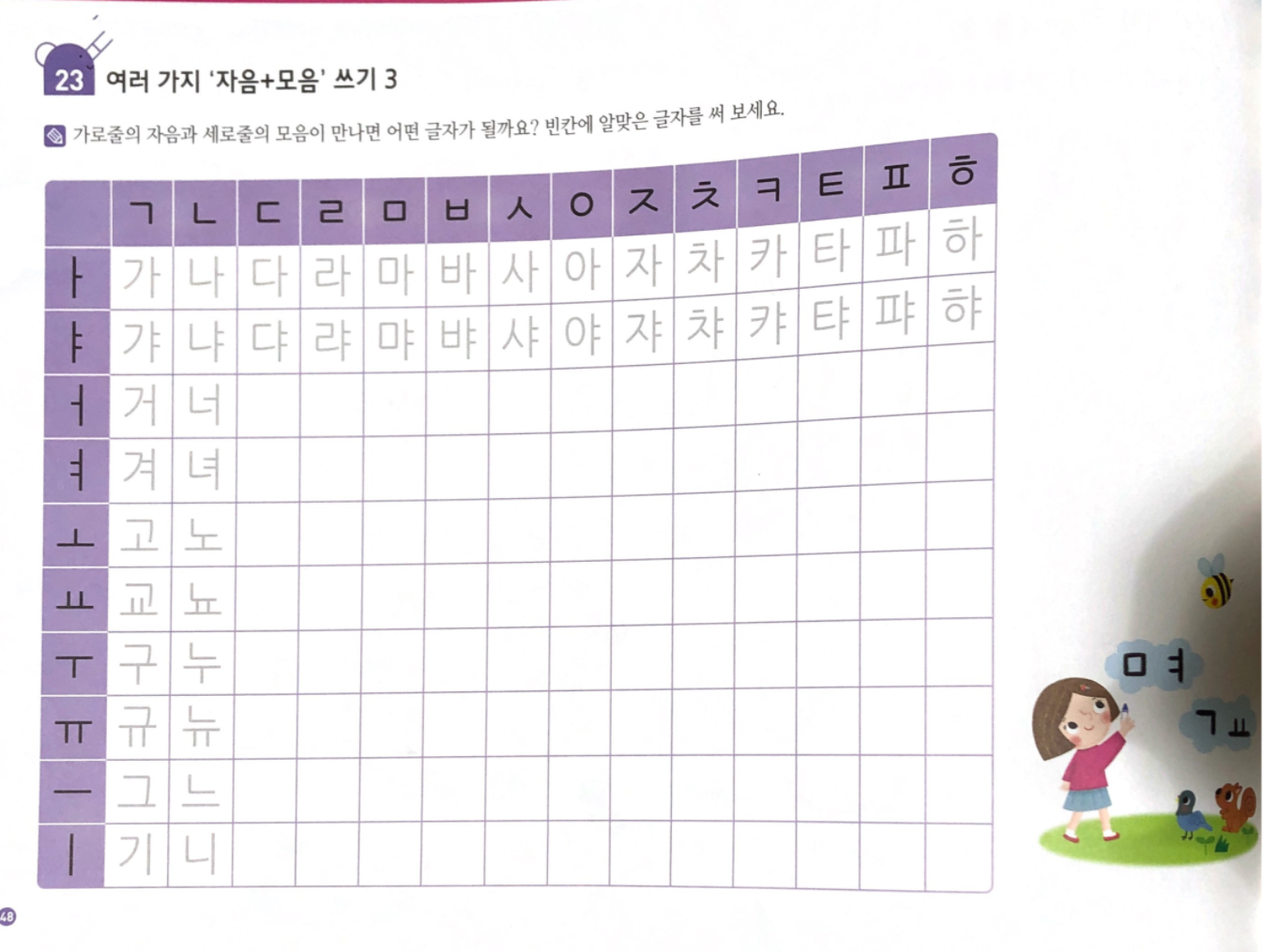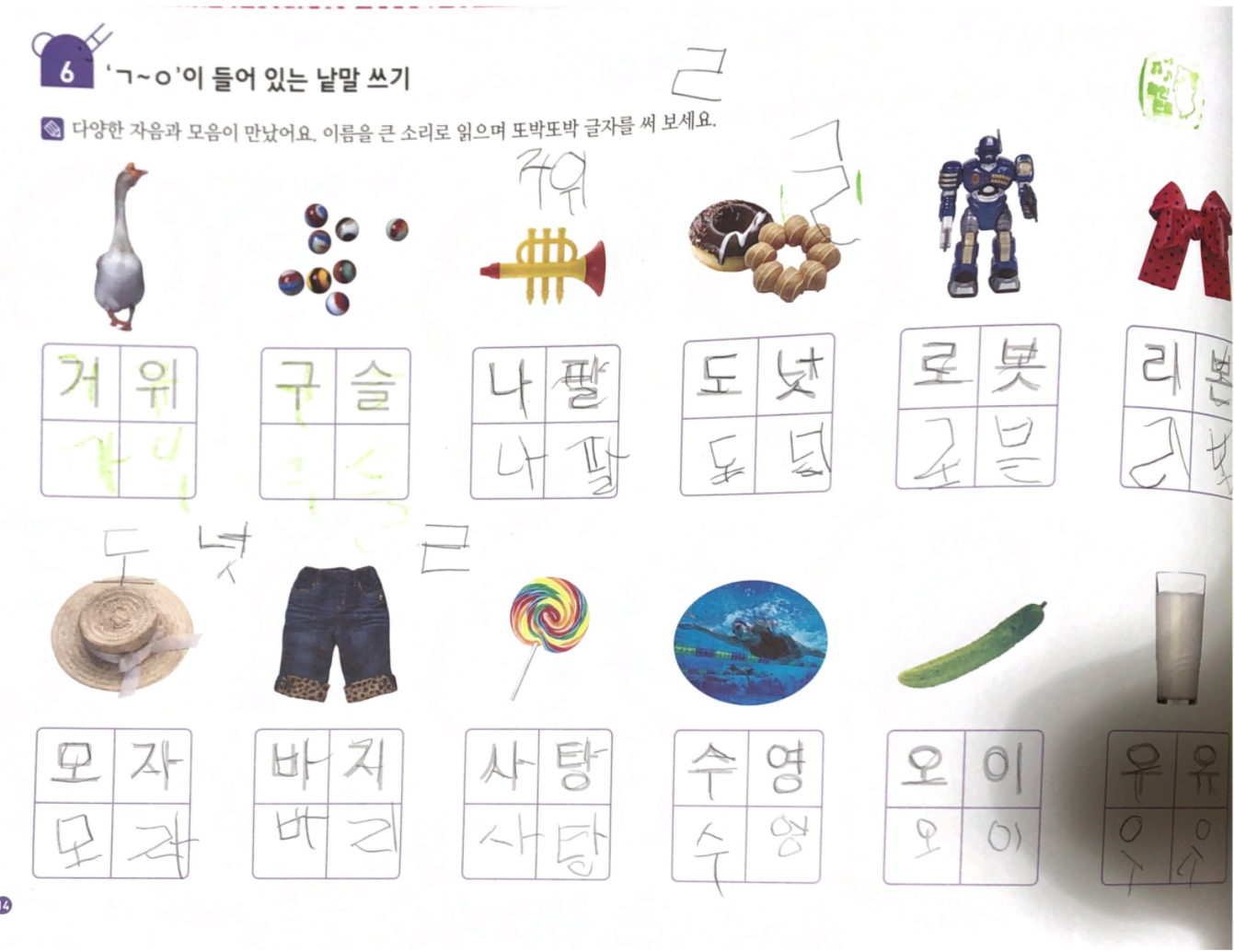 쓰기 분량도 많아지고 저희 아이는 자음과 모음의 결합 원리를 어려워해서 몇 장 풀고 중단했는데요,