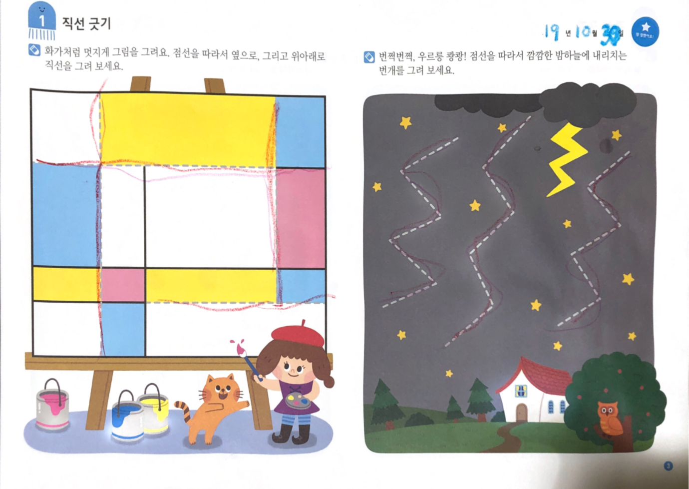 각 장의 앞 쪽에서는 색칠하기, 선 잇기, 미로 찾기, O 하기, 스티커 붙이기 등의 활동을, 뒷 쪽에서 쓰기를 연습하는데요, 다양한 활동으로 구성되어 있어 아이가 무척 재미있어했답니다.