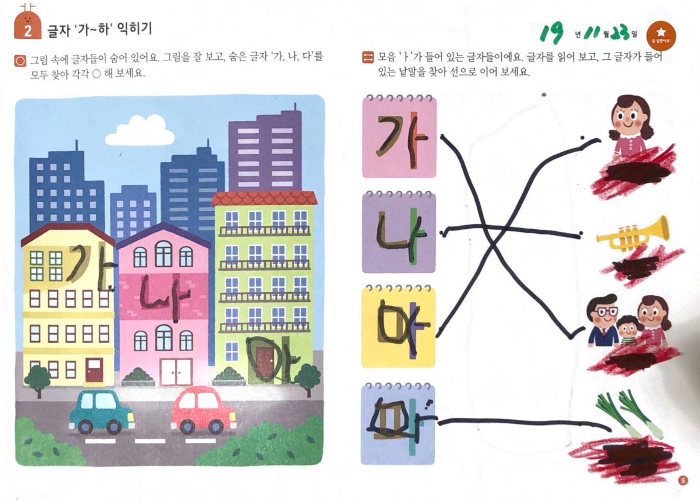 자동차 번호판, 가게 간판, 친구들 이름... 통글자와 쉬운 단어 위주로 자연스럽게 익혀가더라고요.