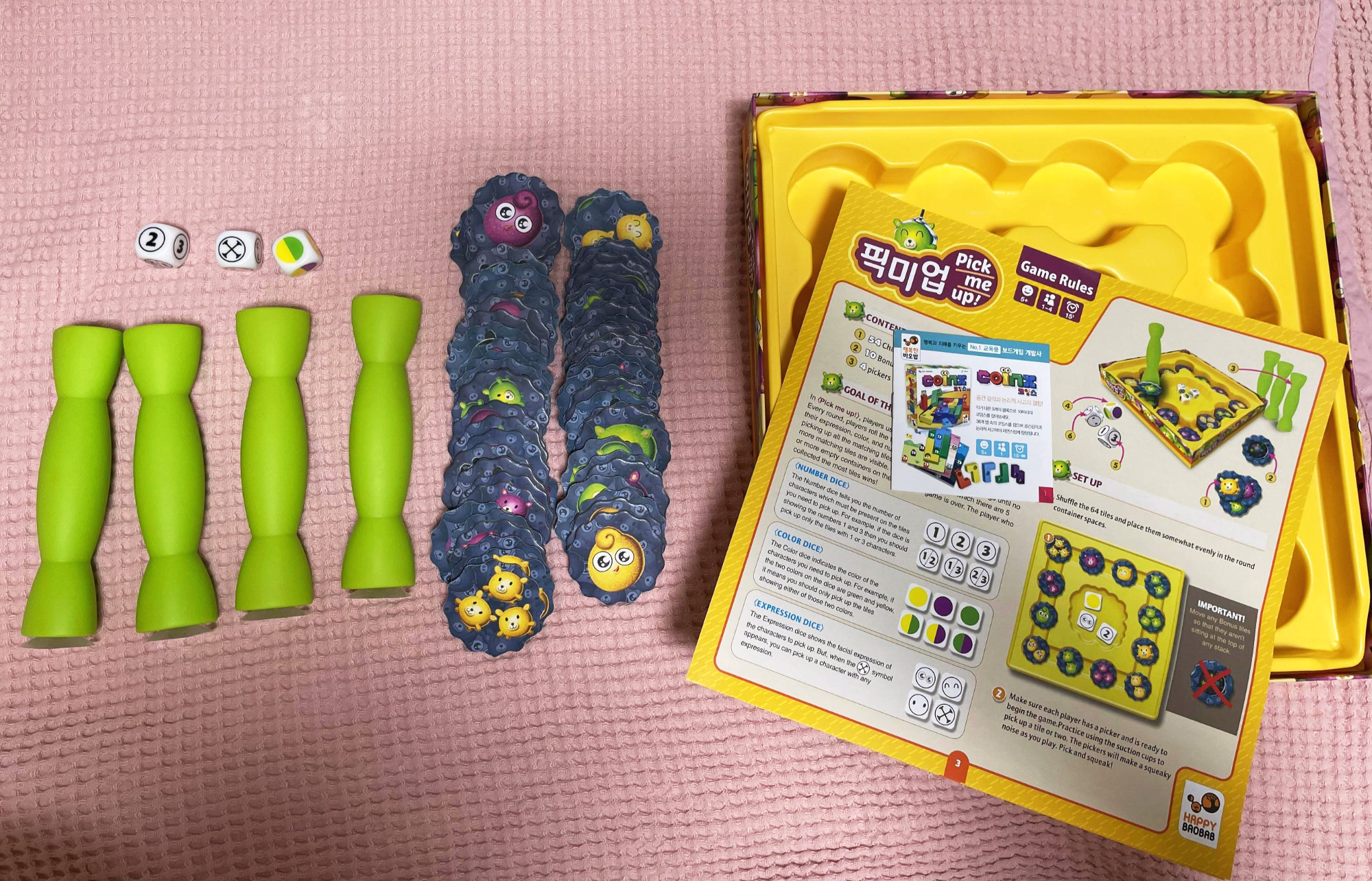 픽미업 게임 구성물 상자를 열면 위와 같은 구성물이 들어있어요.