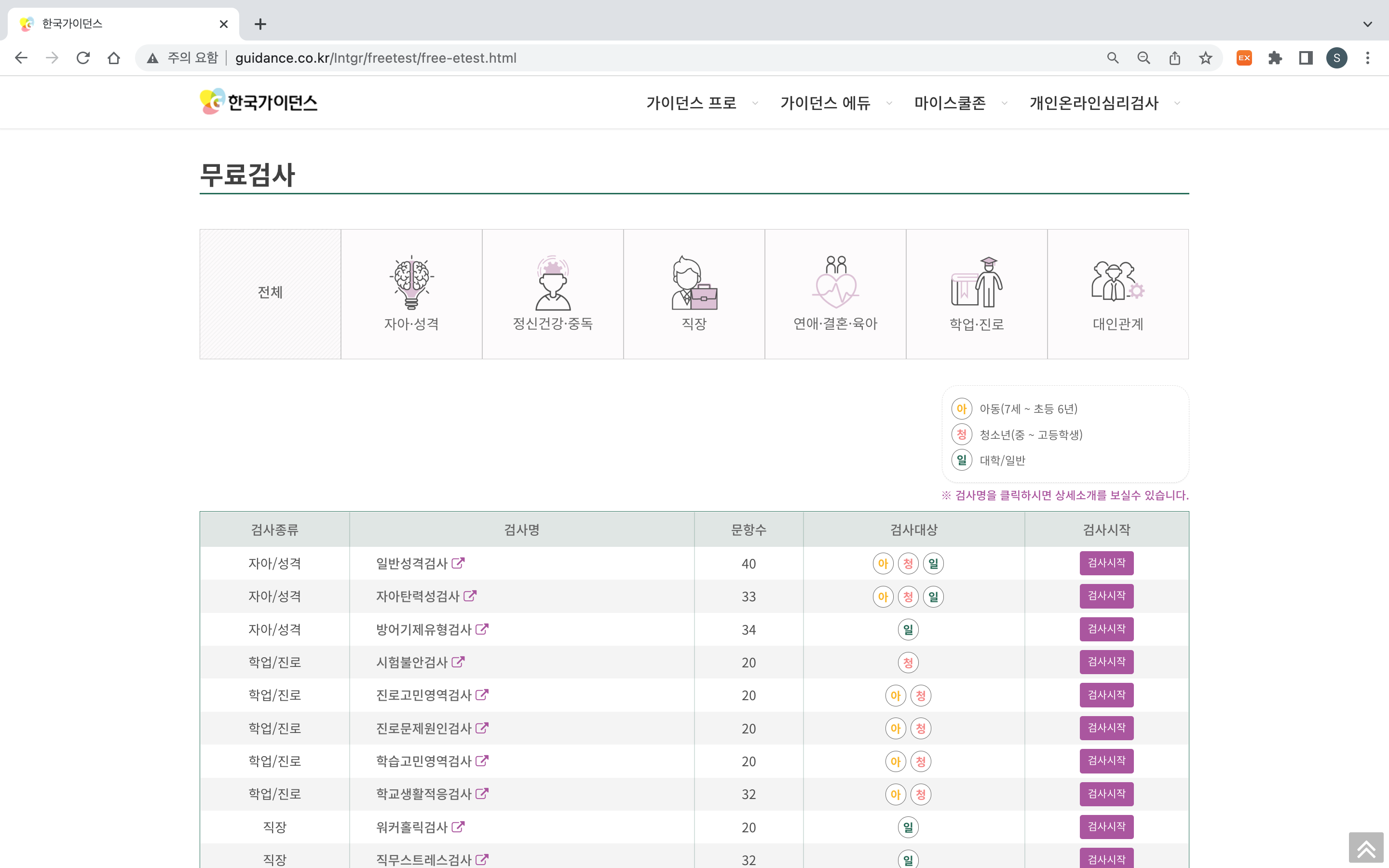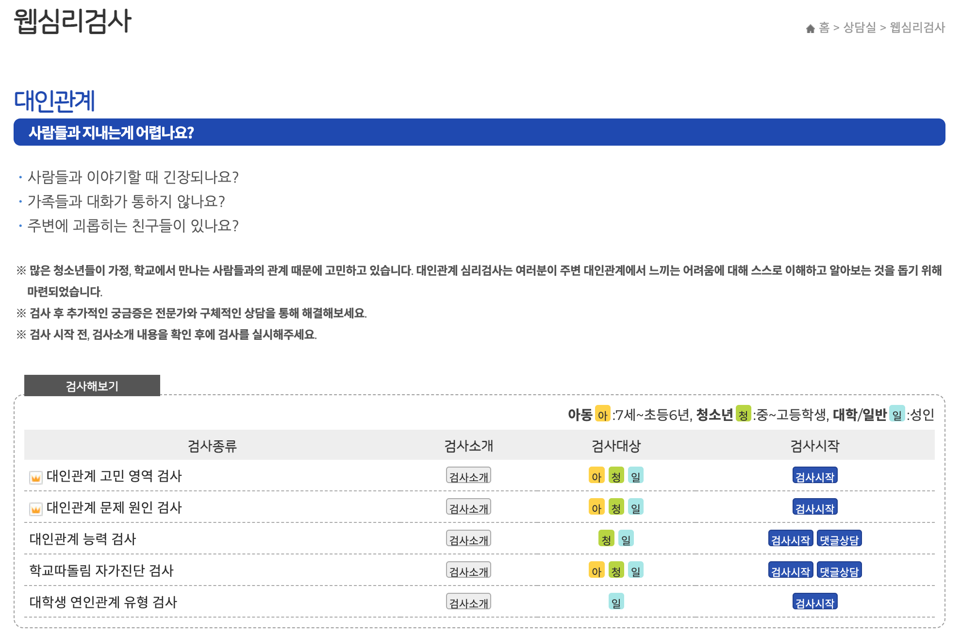 검사 대상 연령은 아동(7세~6학년), 청소년(중~고등학생), 일반(성인)으로 나뉘어있으니