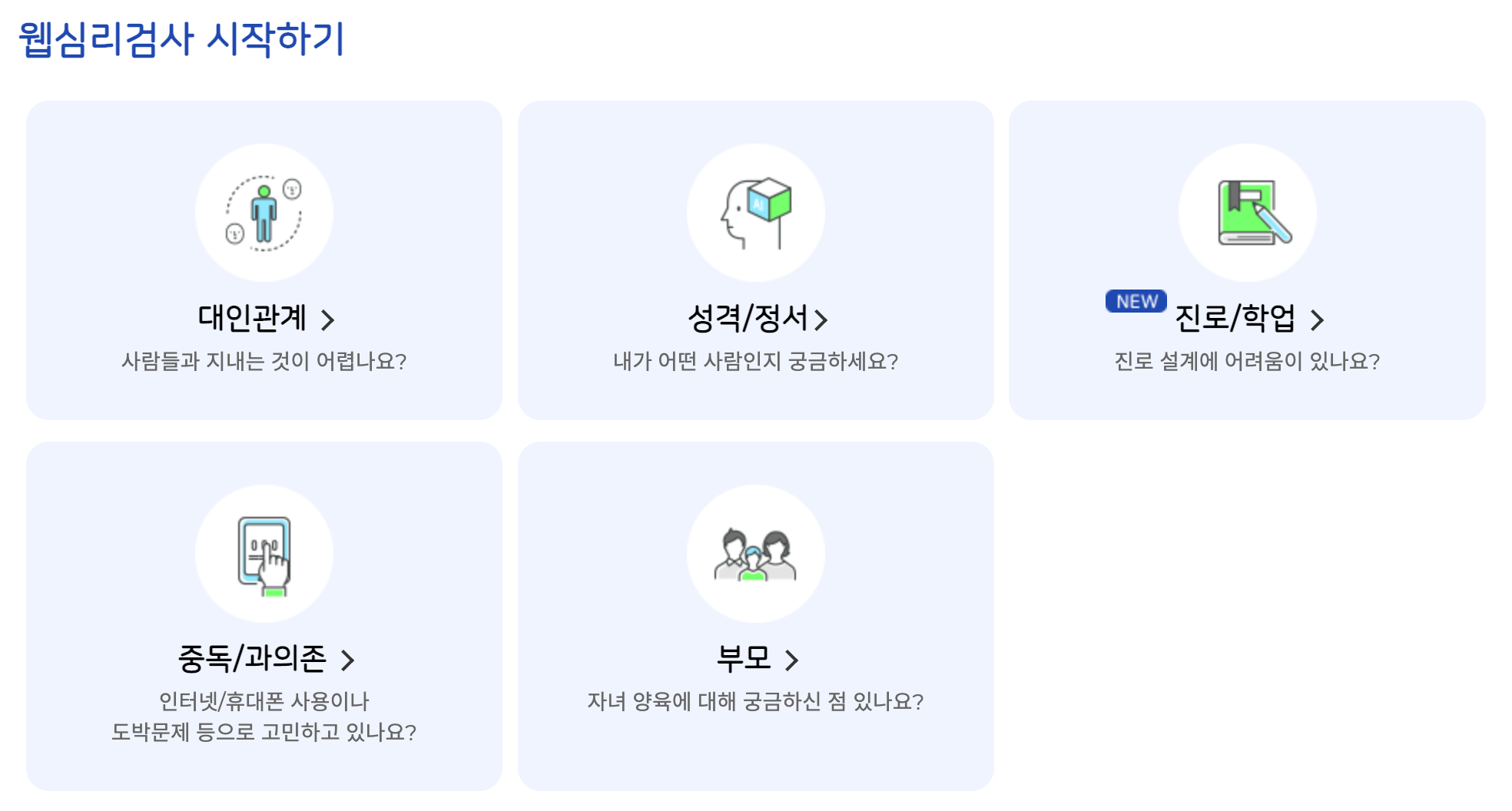 모든 검사 목록 자아·성격 정신건강·중독 직장 연애·결혼·육아 학업·진로 대인관계 ※ 검사명을 클릭하시면 상세소개를 보실수 있습니다.