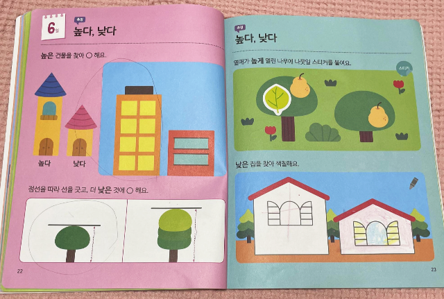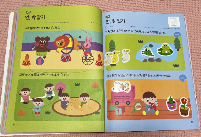 위, 아래, 앞, 뒤, 안, 밖 등 공간도 학습하고요.